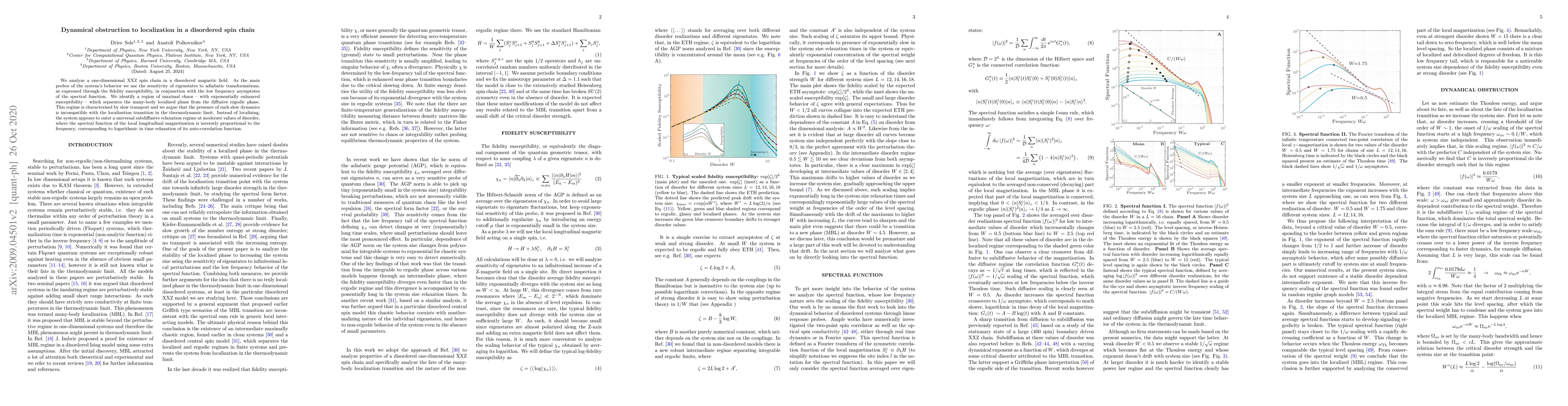 We analyze a one-dimensional XXZ spin chain in a disordered magnetic field. As the main probes of the system's behavior we use the sensitivity of eigenstates to adiabatic transformations, as expressed through the fidelity susceptibility, in conjunction with the low frequency asymptotes of the spectral function. We identify a region of maximal chaos -- with exponentially enhanced susceptibility -- which separates the many-body localized phase from the diffusive ergodic phase. This regime is characterized by slow transport and we argue that the presence of such slow dynamics is incompatible with the localization transition in the thermodynamic limit. Instead of localizing, the system appears to enter a universal subdiffusive relaxation regime at moderate values of disorder, where the spectral function of the local longitudinal magnetization is inversely proportional to the frequency, corresponding to logarithmic in time relaxation of its auto-correlation function.