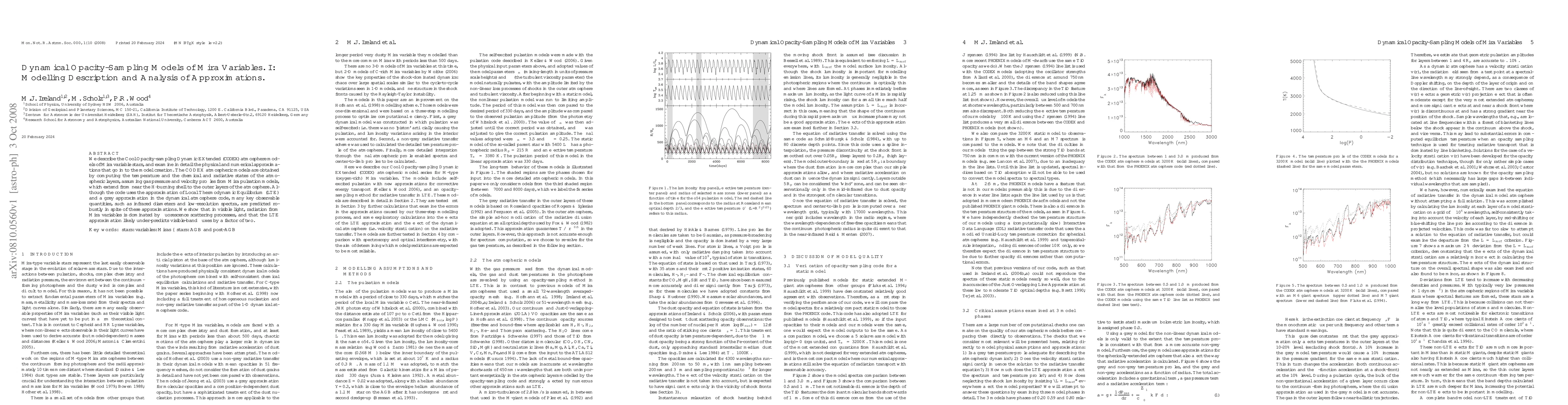 We describe the Cool Opacity-sampling Dynamic EXtended (CODEX) atmosphere models of Mira variable stars, and examine in detail the physical and numerical approximations that go in to the model creation. The CODEX atmospheric models are obtained by computing the temperature and the chemical and radiative states of the atmospheric layers, assuming gas pressure and velocity profiles from Mira pulsation models, which extend from near the H-burning shell to the outer layers of the atmosphere. Although the code uses the approximation of Local Thermodynamic Equilibrium (LTE) and a grey approximation in the dynamical atmosphere code, many key observable quantities, such as infrared diameters and low-resolution spectra, are predicted robustly in spite of these approximations. We show that in visible light, radiation from Mira variables is dominated by fluorescence scattering processes, and that the LTE approximation likely under-predicts visible-band fluxes by a factor of two.