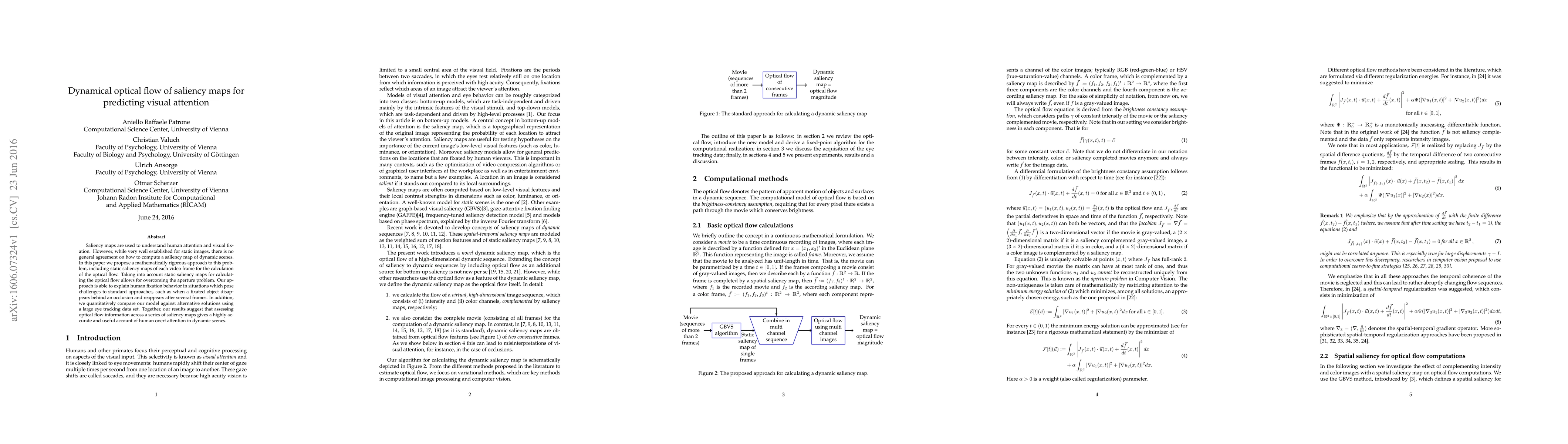 Saliency maps are used to understand human attention and visual fixation. However, while very well established for static images, there is no general agreement on how to compute a saliency map of dynamic scenes. In this paper we propose a mathematically rigorous approach to this prob- lem, including static saliency maps of each video frame for the calculation of the optical flow. Taking into account static saliency maps for calculating the optical flow allows for overcoming the aperture problem. Our ap- proach is able to explain human fixation behavior in situations which pose challenges to standard approaches, such as when a fixated object disappears behind an occlusion and reappears after several frames. In addition, we quantitatively compare our model against alternative solutions using a large eye tracking data set. Together, our results suggest that assessing optical flow information across a series of saliency maps gives a highly accurate and useful account of human overt attention in dynamic scenes.
