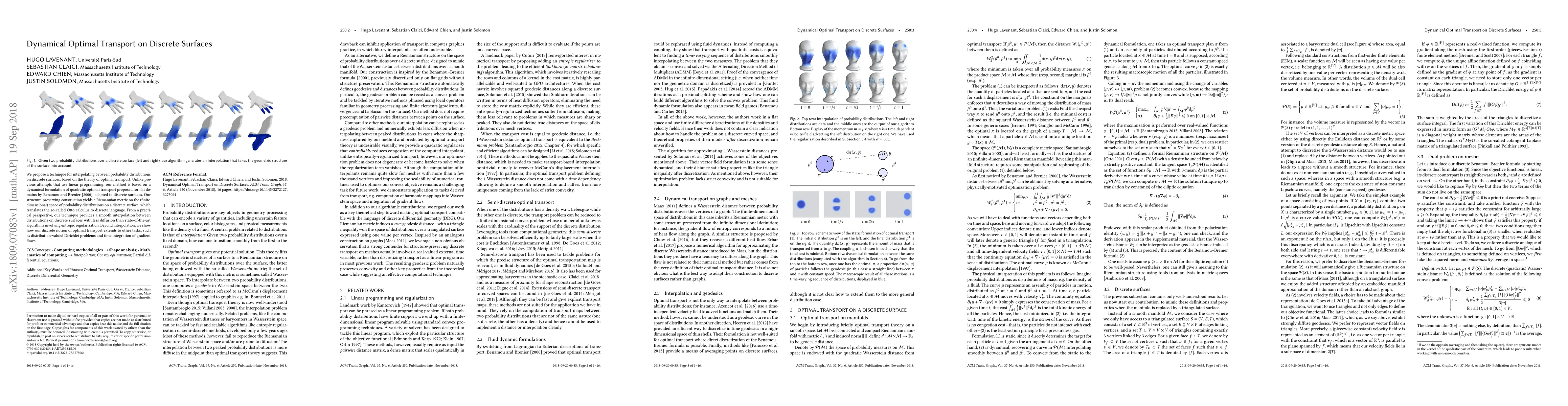 A new method for interpolating between probability distributions on discrete surfaces is proposed using dynamic optimal transport theory, offering a smooth interpolation with less diffusion than existing algorithms.
