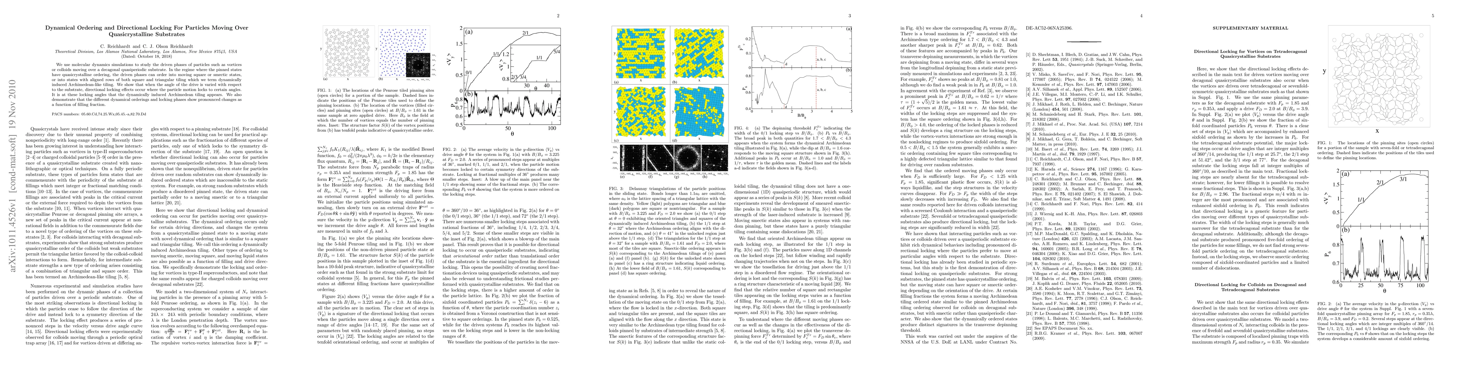 This paper investigates the dynamical behavior of particles on a quasicrystalline substrate using molecular dynamics simulations, revealing various ordered phases including square, smectic, and Archimedean-like tilings. Directional locking effects emerge at specific drive angles, correlating with the appearance of these ordered states.