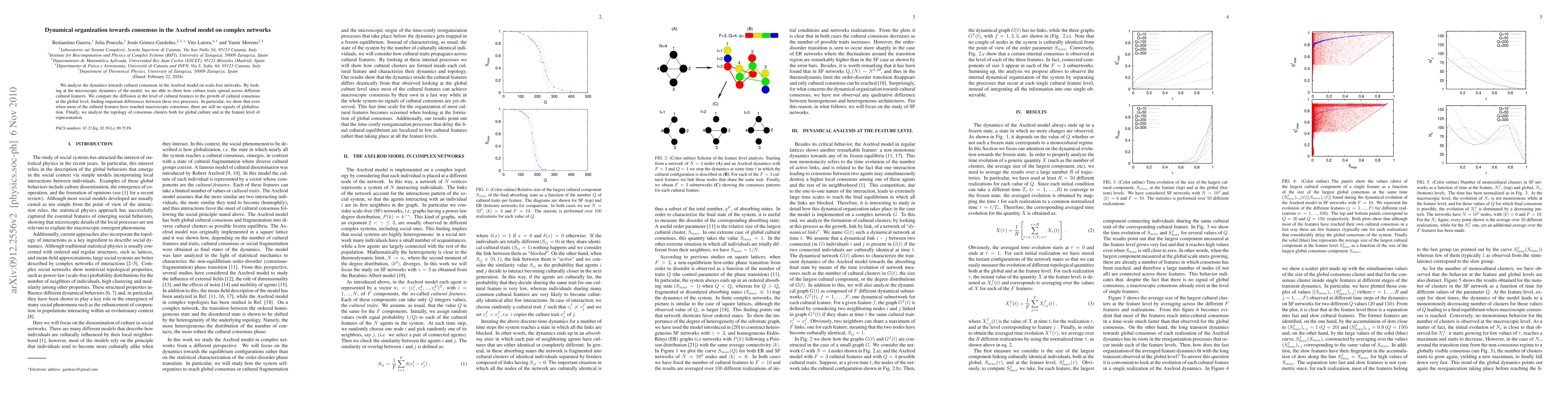 This paper examines the dynamics of cultural consensus in the Axelrod model on scale-free networks, revealing differences in the diffusion of cultural traits and the growth of consensus. It finds that while most cultural features may reach consensus, global consensus is not necessarily achieved, and analyzes the topology of consensus clusters.