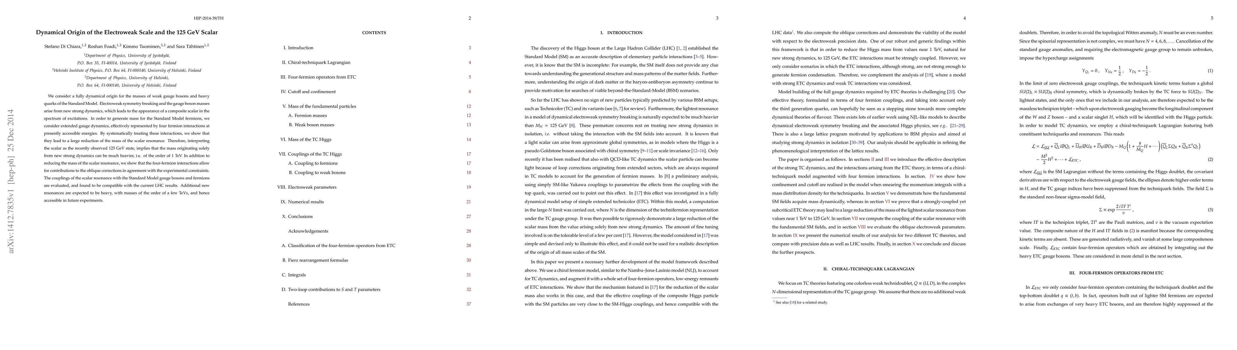 We consider a fully dynamical origin for the masses of weak gauge bosons and heavy quarks of the Standard Model. Electroweak symmetry breaking and the gauge boson masses arise from new strong dynamics, which leads to the appearance of a composite scalar in the spectrum of excitations. In order to generate mass for the Standard Model fermions, we consider extended gauge dynamics, effectively represented by four fermion interactions at presently accessible energies. By systematically treating these interactions, we show that they lead to a large reduction of the mass of the scalar resonance. Therefore, interpreting the scalar as the recently observed 125 GeV state, implies that the mass originating solely from new strong dynamics can be much heavier, {\em {\em i.e.}} of the order of 1 TeV. In addition to reducing the mass of the scalar resonance, we show that the four-fermion interactions allow for contributions to the oblique corrections in agreement with the experimental constraints. The couplings of the scalar resonance with the Standard Model gauge bosons and fermions are evaluated, and found to be compatible with the current LHC results. Additional new resonances are expected to be heavy, with masses of the order of a few TeVs, and hence accessible in future experiments.