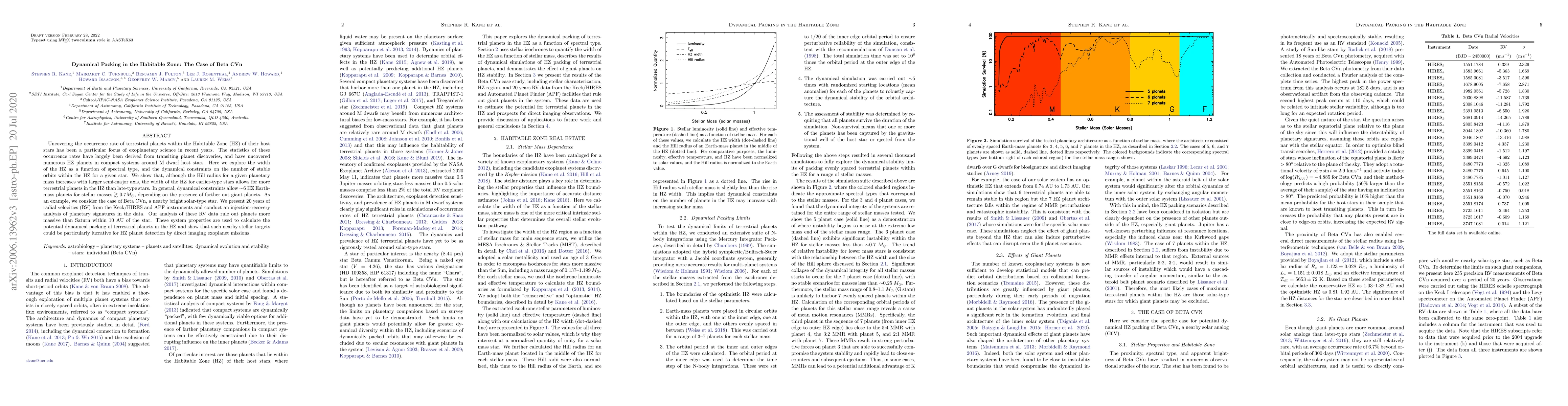 Uncovering the occurrence rate of terrestrial planets within the Habitable Zone (HZ) of their host stars has been a particular focus of exoplanetary science in recent years. The statistics of these occurrence rates have largely been derived from transiting planet discoveries, and have uncovered numerous HZ planets in compact systems around M dwarf host stars. Here we explore the width of the HZ as a function of spectral type, and the dynamical constraints on the number of stable orbits within the HZ for a given star. We show that, although the Hill radius for a given planetary mass increases with larger semi-major axis, the width of the HZ for earlier-type stars allows for more terrestrial planets in the HZ than late-type stars. In general, dynamical constraints allow $\sim$6 HZ Earth-mass planets for stellar masses $\gtrsim 0.7 M_\odot$, depending on the presence of farther out giant planets. As an example, we consider the case of Beta CVn, a nearby bright solar-type star. We present 20 years of radial velocities (RV) from the Keck/HIRES and APF instruments and conduct an injection-recovery analysis of planetary signatures in the data. Our analysis of these RV data rule out planets more massive than Saturn within 10~AU of the star. These system properties are used to calculate the potential dynamical packing of terrestrial planets in the HZ and show that such nearby stellar targets could be particularly lucrative for HZ planet detection by direct imaging exoplanet missions.