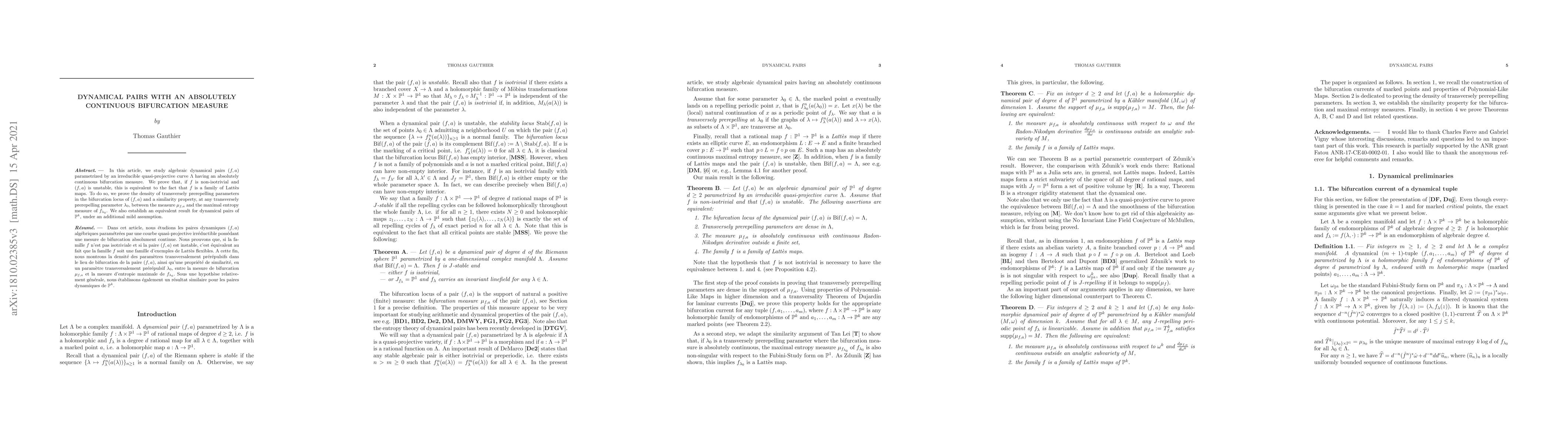 In this article, we study algebraic dynamical pairs $(f,a)$ parametrized by an irreducible quasi-projective curve $\Lambda$ having an absolutely continuous bifurcation measure. We prove that, if $f$ is non-isotrivial and $(f,a)$ is unstable, this is equivalent to the fact that $f$ is a family of Latt\`es maps. To do so, we prove the density of transversely prerepelling parameters in the bifucation locus of $(f,a)$ and a similarity property, at any transversely prerepelling parameter $\lambda_0$, between the measure $\mu_{f,a}$ and the maximal entropy measure of $f_{\lambda_0}$. We also establish an equivalent result for dynamical pairs of $\mathbb{P}^k$, under an additional assumption.