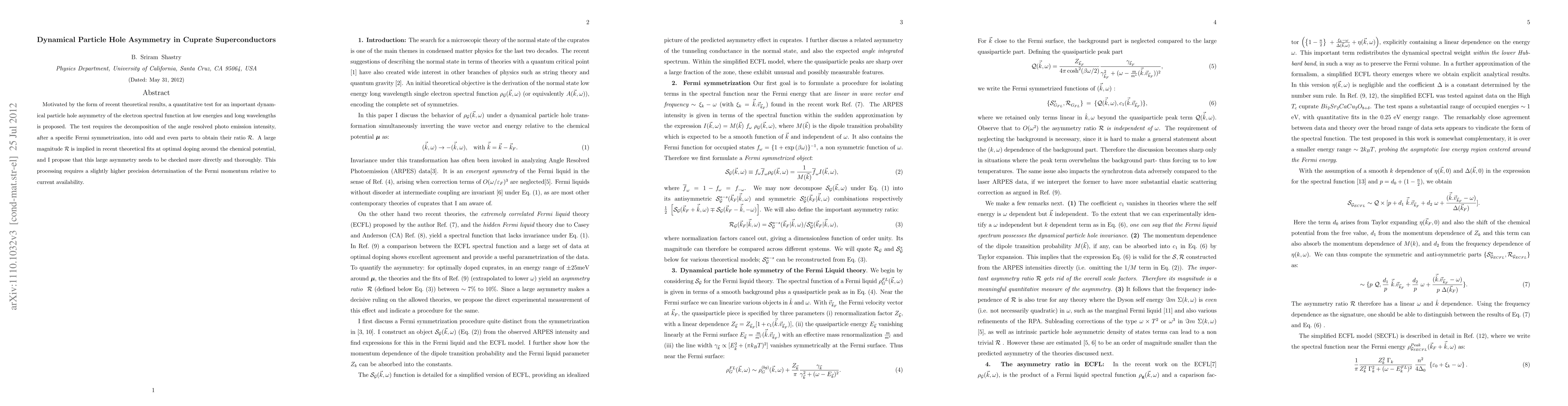 Motivated by the form of recent theoretical results, a quantitative test for an important dynamical particle hole asymmetry of the electron spectral function at low energies and long wavelengths is proposed. The test requires the decomposition of the angle resolved photo emission intensity, after a specific Fermi symmetrization, into odd and even parts to obtain their ratio ${\cal R}$. A large magnitude ${\cal R}$ is implied in recent theoretical fits at optimal doping around the chemical potential, and I propose that this large asymmetry needs to be checked more directly and thoroughly. This processing requires a slightly higher precision determination of the Fermi momentum relative to current availability.