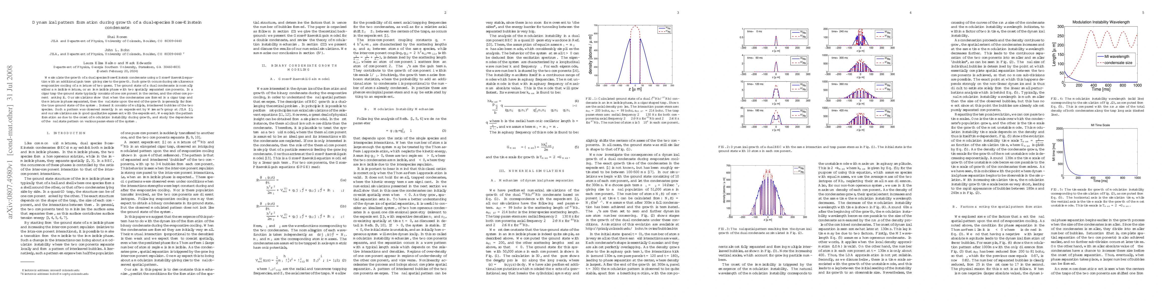 This paper simulates the growth of a dual-species Bose-Einstein condensate in a cigar trap, revealing that the final state often consists of interleaved bubbles rather than the expected phase-separated ground state. The observed pattern formation is attributed to modulation instability during growth, aligning with recent experimental observations.