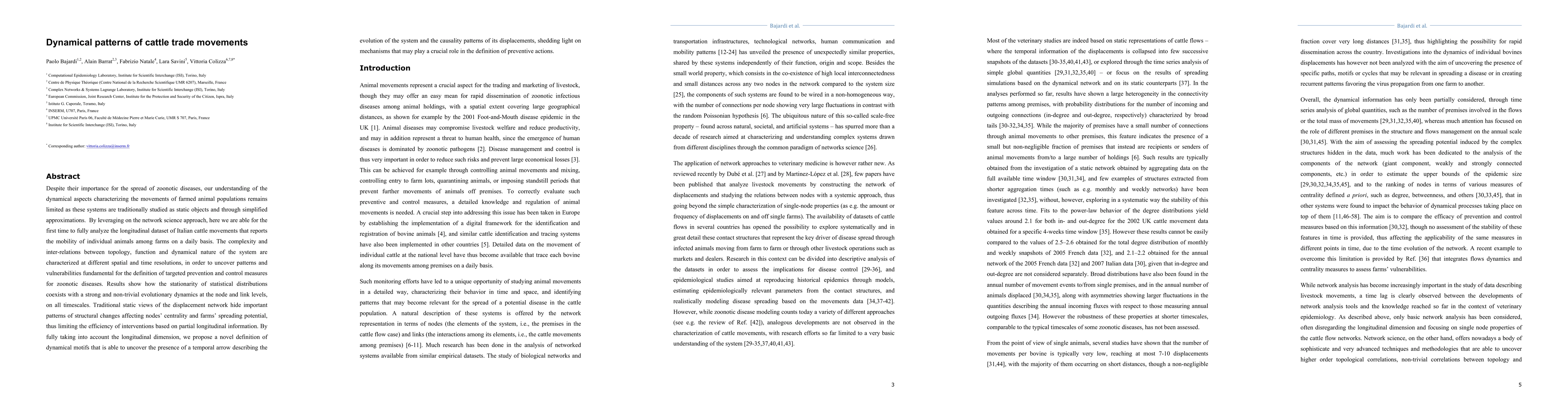 This paper employs a network science approach to analyze the dynamic patterns of Italian cattle trade movements, revealing complex evolutionary dynamics and structural changes that traditional static views overlook. The study uncovers temporal evolution and causality patterns in animal displacements, providing insights for targeted zoonotic disease prevention measures.