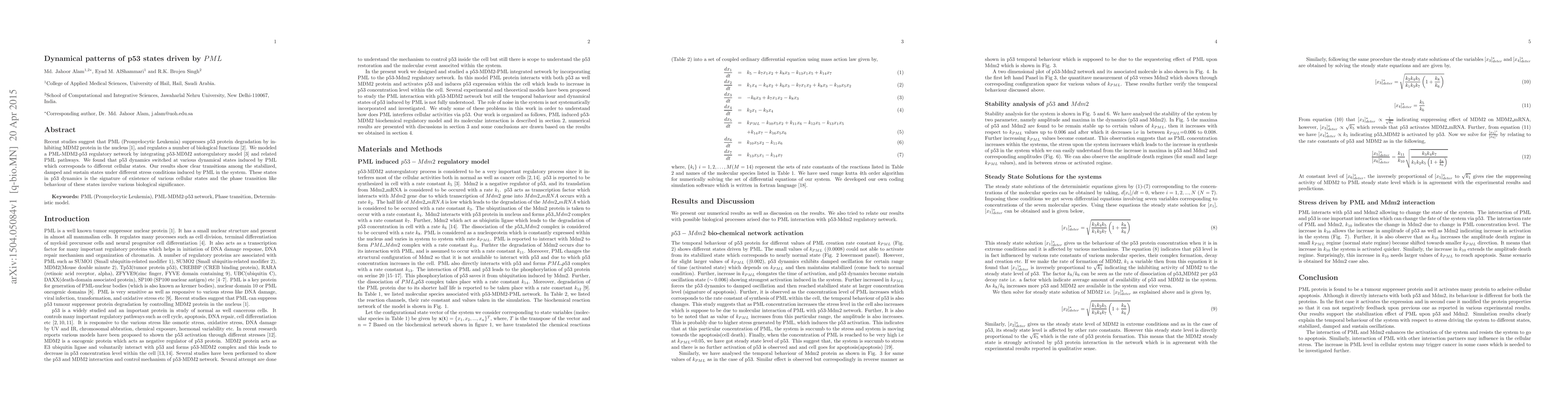 Recent studies suggest that PML (Promyelocytic Leukemia) suppresses p53 protein degradation by inhibiting MDM2 protein in the nucleus [1], and regulates a number of biological functions [2]. We modeled a PML-MDM2-p53 regulatory network by integrating p53-MDM2 autoregulatory model [3] and related PML pathways. We found that p53 dynamics switched at various dynamical states induced by PML which corresponds to different cellular states. Our results show clear transitions among the stabilized, damped and sustain states under different stress conditions induced by PML in the system. These states in p53 dynamics is the signature of existence of various cellular states and the phase transition like behaviour of these states involve various biological significance.