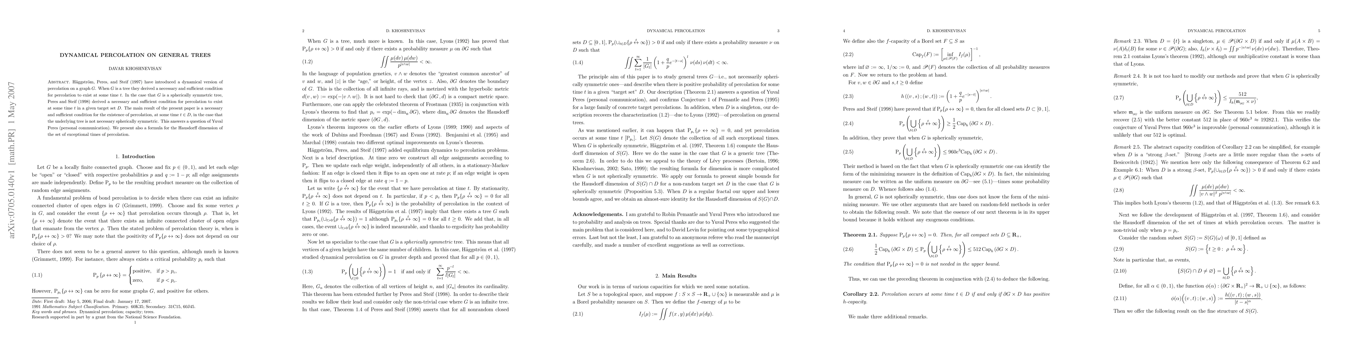 H\"aggstr\"om, Peres, and Steif (1997) have introduced a dynamical version of percolation on a graph $G$. When $G$ is a tree they derived a necessary and sufficient condition for percolation to exist at some time $t$. In the case that $G$ is a spherically symmetric tree, H\"aggstr\"om, Peres, and Steif (1997) derived a necessary and sufficient condition for percolation to exist at some time $t$ in a given target set $D$. The main result of the present paper is a necessary and sufficient condition for the existence of percolation, at some time $t\in D$, in the case that the underlying tree is not necessary spherically symmetric. This answers a question of Yuval Peres (personal communication). We present also a formula for the Hausdorff dimension of the set of exceptional times of percolation.