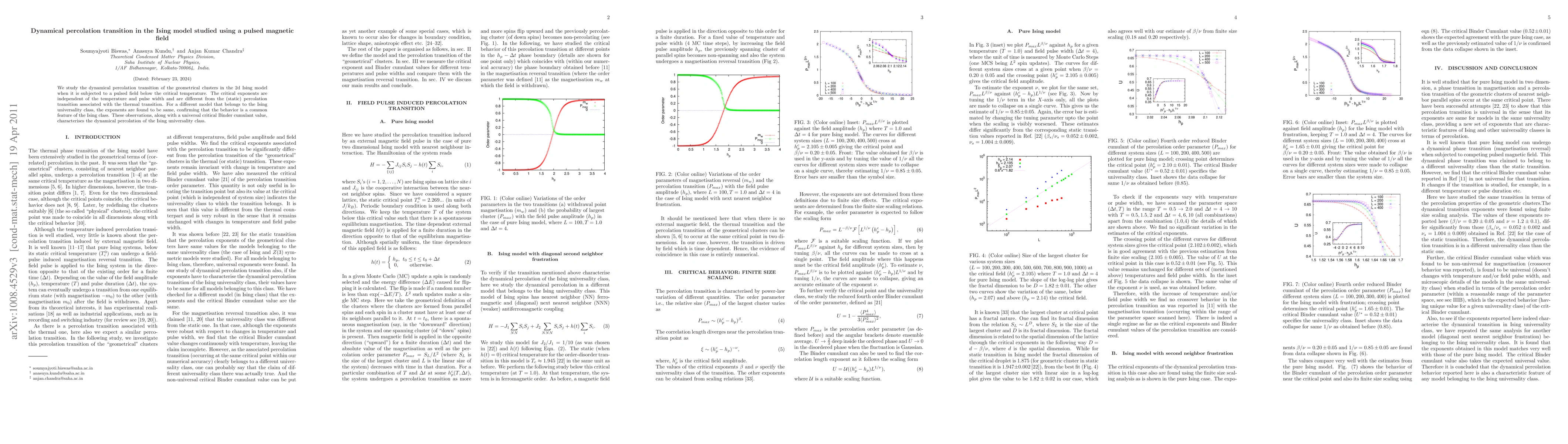 This study investigates the dynamical percolation transition in the 2D Ising model under pulsed magnetic fields, revealing critical exponents that are temperature and pulse width independent and distinct from static percolation transitions. The findings confirm that these behaviors are universal features of the Ising class, supported by a universal critical Binder cumulant value.