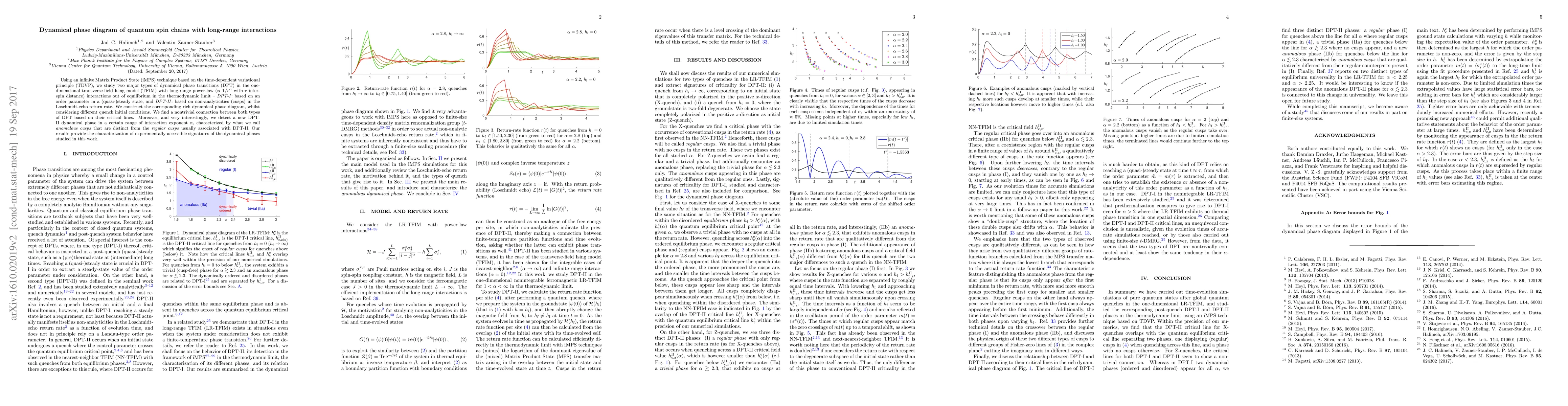 The study utilizes infinite Matrix Product States to explore dynamical phase transitions in spin chains with long-range interactions in the TFIM model, identifying two types of transitions and constructing a detailed dynamical phase diagram. Notably, a new type of anomalous cusps is found, distinguishing from regular cusps typically associated with the second type of transition.