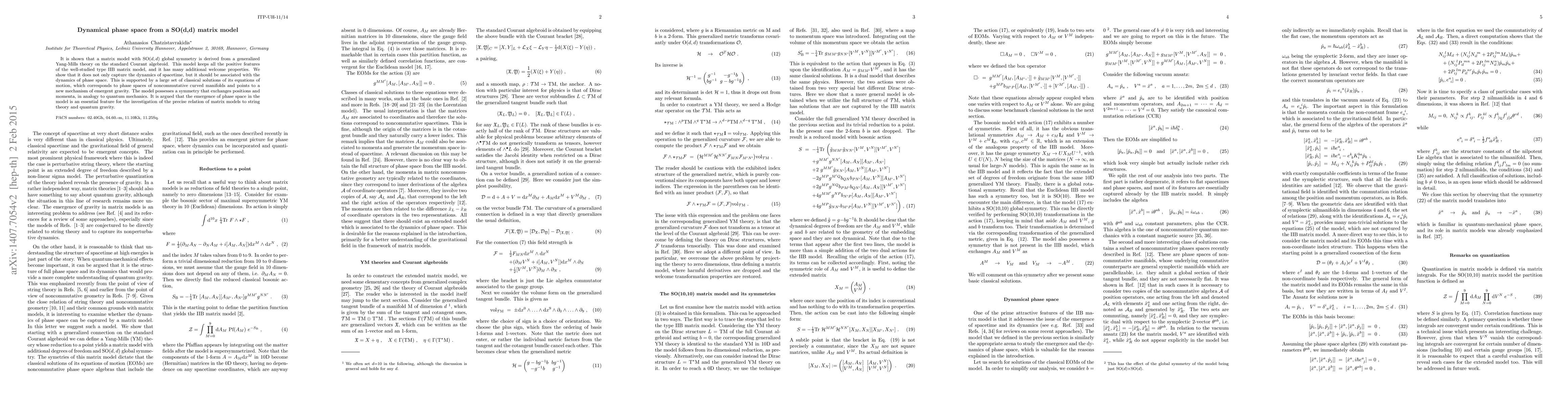 It is shown that a matrix model with SO(d,d) global symmetry is derived from a generalized Yang-Mills theory on the standard Courant algebroid. This model keeps all the positive features of the well-studied type IIB matrix model, and it has many additional welcome properties. We show that it does not only capture the dynamics of spacetime, but it should be associated with the dynamics of phase space. This is supported by a large set of classical solutions of its equations of motion, which corresponds to phase spaces of noncommutative curved manifolds and points to a new mechanism of emergent gravity. The model possesses an additional symmetry that exchanges positions and momenta, in analogy to quantum mechanics. It is argued that the emergence of phase space in the model is an essential feature for the investigation of the precise relation of matrix models to string theory and quantum gravity.