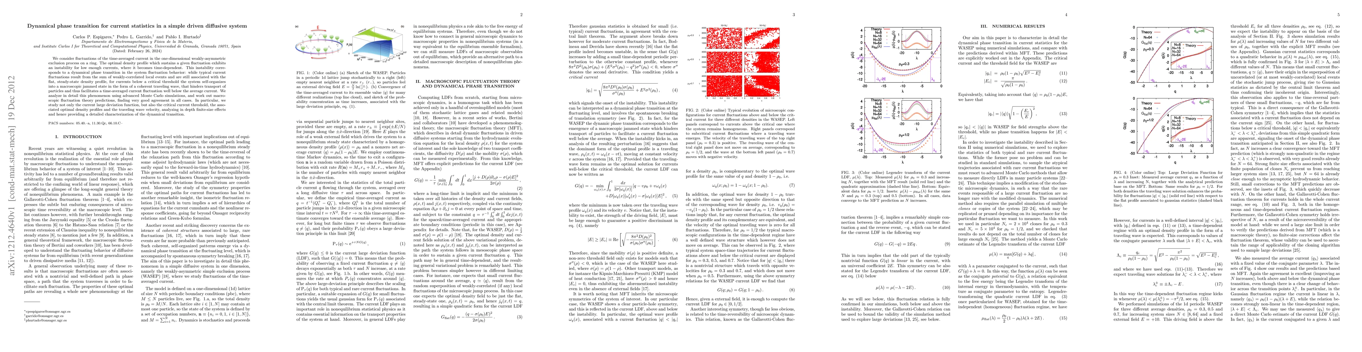 We consider fluctuations of the time-averaged current in the one-dimensional weakly-asymmetric exclusion process on a ring. The optimal density profile which sustains a given fluctuation exhibits an instability for low enough currents, where it becomes time-dependent. This instability corresponds to a dynamical phase transition in the system fluctuation behavior: while typical current fluctuations result from the sum of weakly-correlated local events and are still associated with the flat, steady-state density profile, for currents below a critical threshold the system self-organizes into a macroscopic jammed state in the form of a coherent traveling wave, that hinders transport of particles and thus facilitates a time-averaged current fluctuation well below the average current. We analyze in detail this phenomenon using advanced Monte Carlo simulations, and work out macroscopic fluctuation theory predictions, finding very good agreement in all cases. In particular, we study not only the current large deviation function, but also the critical current threshold, the associated optimal density profiles and the traveling wave velocity, analyzing in depth finite-size effects and hence providing a detailed characterization of the dynamical transition.