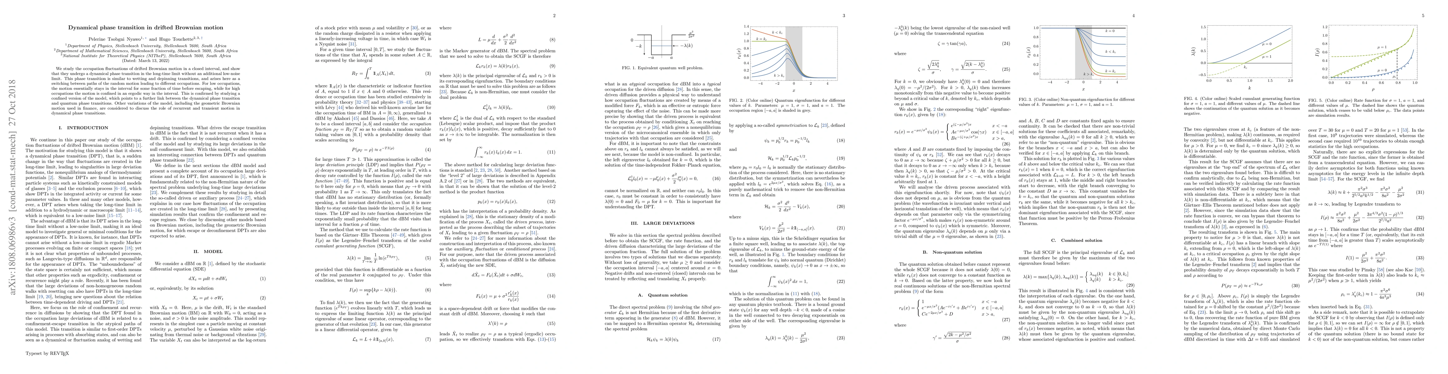 This paper investigates the occupation fluctuations of drifted Brownian motion in a closed interval, revealing a dynamical phase transition in the long-time limit. The transition resembles wetting and depinning transitions, switching between different paths that lead to varying occupancy levels, with implications for quantum phase transitions.
