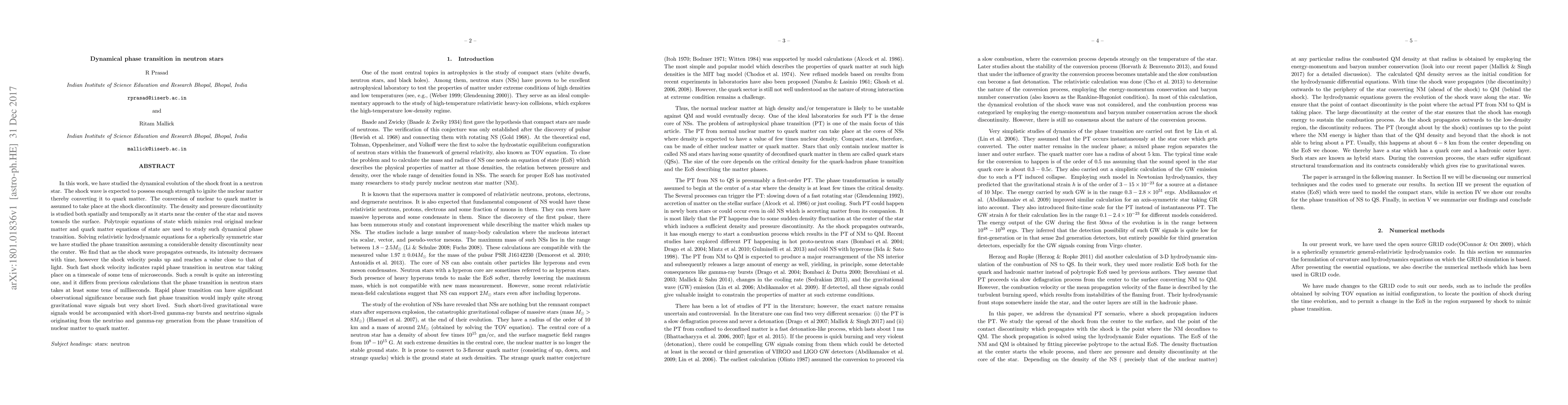 In this work, we have studied the dynamical evolution of the shock front in a neutron star. The shock wave is expected to possess enough strength to ignite the nuclear matter thereby converting it to quark matter. The conversion of nuclear to quark matter is assumed to take place at the shock discontinuity. The density and pressure discontinuity is studied both spatially and temporally as it starts near the center of the star and moves towards the surface. Polytropic equations of state which mimics real original nuclear matter and quark matter equations of state are used to study such dynamical phase transition. Solving relativistic hydrodynamic equations for a spherically symmetric star we have studied the phase transition assuming a considerable density discontinuity near the center. We find that as the shock wave propagates outwards, its intensity decreases with time, however the shock velocity peaks up and reaches a value close to that of light. Such fast shock velocity indicates rapid phase transition in neutron star taking place on a timescale of some tens of microseconds. Such a result is quite an interesting one, and it differs from previous calculations that the phase transition in neutron stars takes at least some tens of milliseconds. Rapid phase transition can have significant observational significance because such fast phase transition would imply quite strong gravitational wave signals but very short lived. Such short-lived gravitational wave signals would be accompanied with short-lived gamma-ray bursts and neutrino signals originating from the neutrino and gamma-ray generation from the phase transition of nuclear matter to quark matter.
