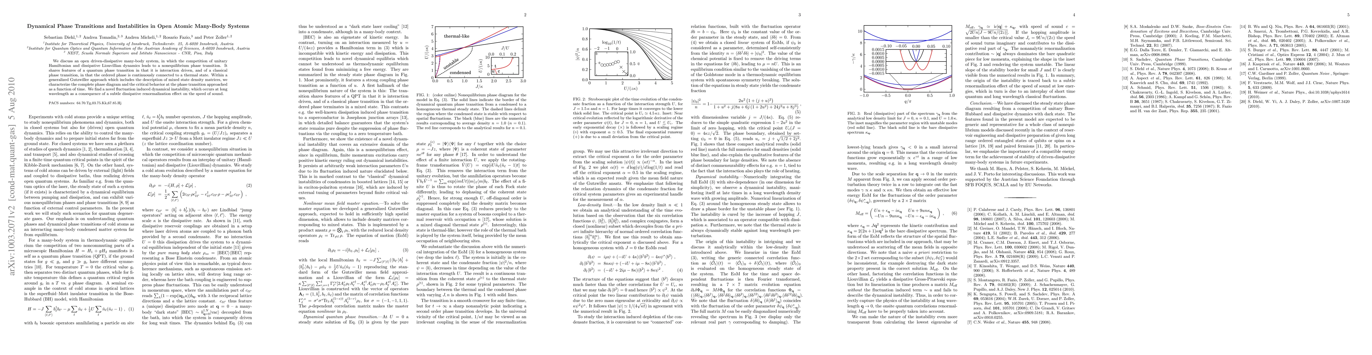 We discuss an open driven-dissipative many-body system, in which the competition of unitary Hamiltonian and dissipative Liouvillian dynamics leads to a nonequilibrium phase transition. It shares features of a quantum phase transition in that it is interaction driven, and of a classical phase transition, in that the ordered phase is continuously connected to a thermal state. Within a generalized Gutzwiller approach which includes the description of mixed state density matrices, we characterize the complete phase diagram and the critical behavior at the phase transition approached as a function of time. We find a novel fluctuation induced dynamical instability, which occurs at long wavelength as a consequence of a subtle dissipative renormalization effect on the speed of sound.