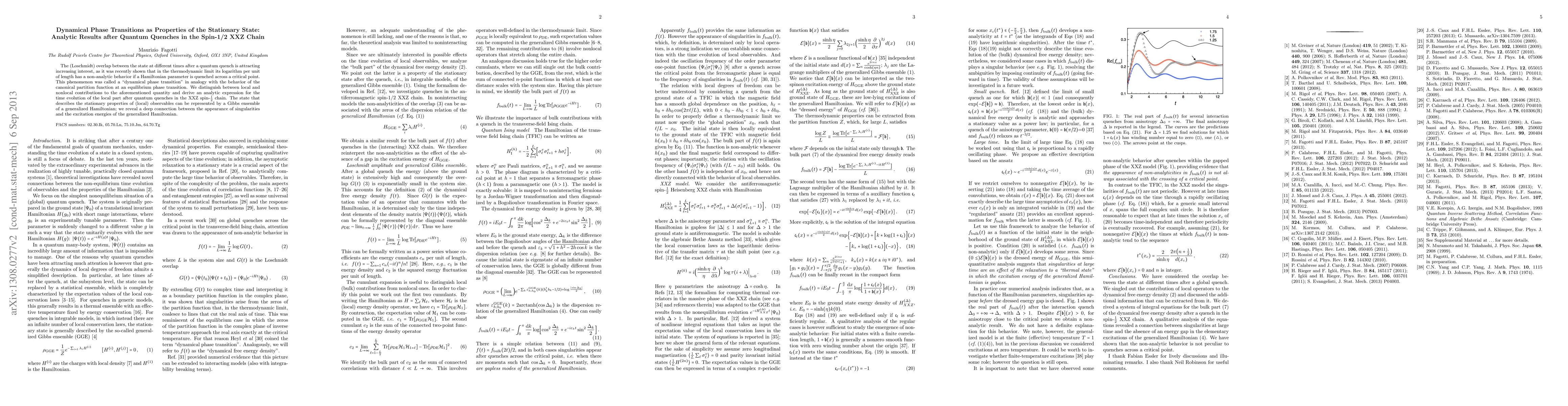 This paper investigates dynamical phase transitions in the spin-1/2 XXZ chain following quantum quenches, deriving an analytic expression for the local part of the Loschmidt overlap. It reveals a connection between singularities in the stationary state and the excitation energies of a generalized Hamiltonian.