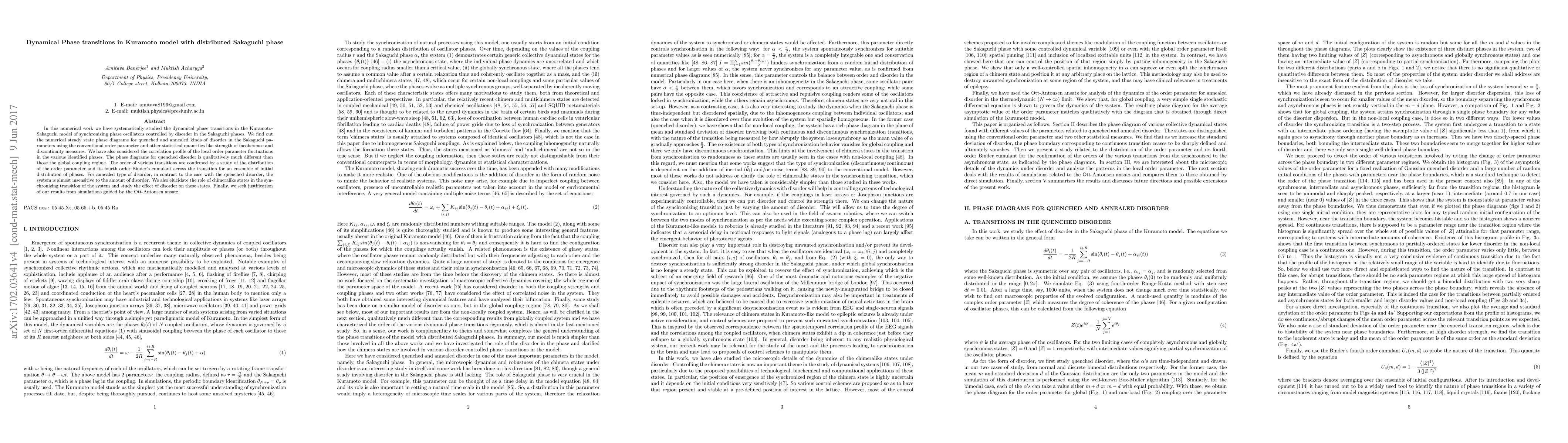 This paper investigates dynamical phase transitions in the Kuramoto-Sakaguchi model with distributed Sakaguchi phases, revealing distinct phase diagrams for quenched and annealed disorder types. The study identifies chimeralike states' role in synchronization transitions and confirms transition orders using order parameter distributions and Binder cumulants.