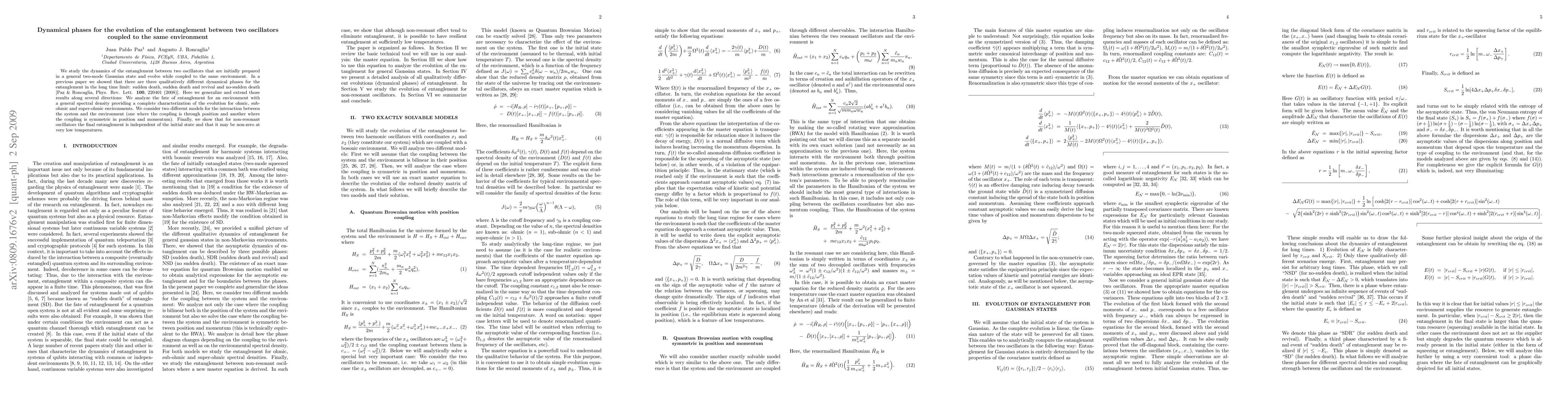 We study the dynamics of the entanglement between two oscillators that are initially prepared in a general two-mode Gaussian state and evolve while coupled to the same environment. In a previous paper we showed that there are three qualitatively different dynamical phases for the entanglement in the long time limit: sudden death, sudden death and revival and no-sudden death [Paz & Roncaglia, Phys. Rev. Lett. 100, 220401 (2008)]. Here we generalize and extend those results along several directions: We analyze the fate of entanglement for an environment with a general spectral density providing a complete characterization of the corresponding phase diagrams for ohmic and sub--ohmic environments (we also analyze the super-ohmic case showing that for such environment the expected behavior is rather different). We also generalize previous studies by considering two different models for the interaction between the system and the environment (first we analyze the case when the coupling is through position and then we examine the case where the coupling is symmetric in position and momentum). Finally, we analyze (both numerically and analytically) the case of non-resonant oscillators. In that case we show that the final entanglement is independent of the initial state and may be non-zero at very low temperatures. We provide a natural interpretation of our results in terms of a simple quantum optics model.
