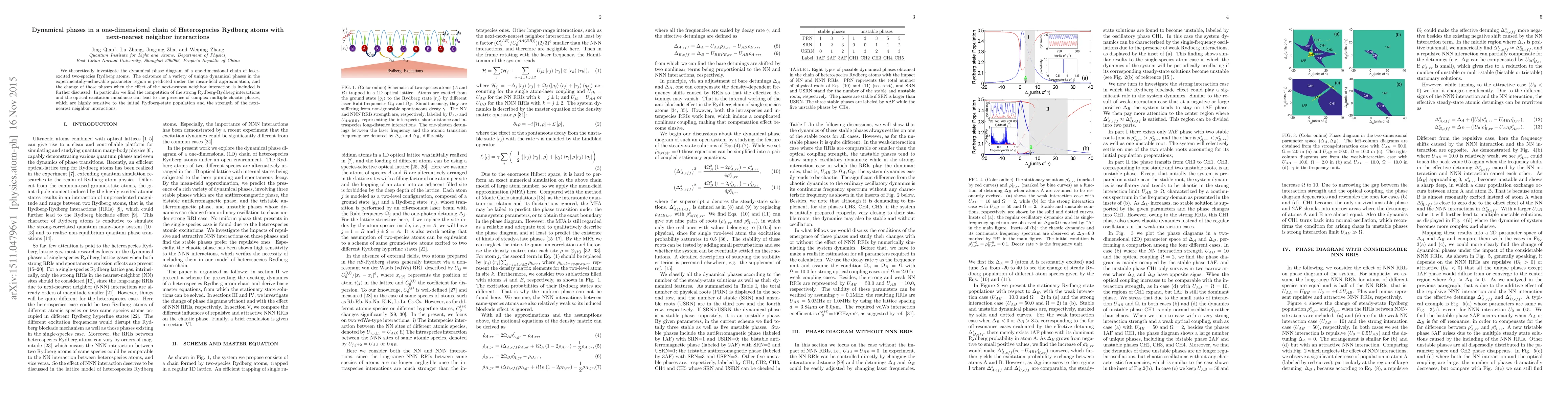 We theoretically investigate the dynamical phase diagram of a one-dimensional chain of laser-excited two-species Rydberg atoms. The existence of a variety of unique dynamical phases in the experimentally-achievable parameter region is predicted under the mean-field approximation, and the change of those phases when the effect of the next-nearest neighbor interaction is included is further discussed. In particular we find the competition of the strong Rydberg-Rydberg interactions and the optical excitation imbalance can lead to the presence of complex multiple chaotic phases, which are highly sensitive to the initial Rydberg-state population and the strength of the next-nearest neighbor interactions.