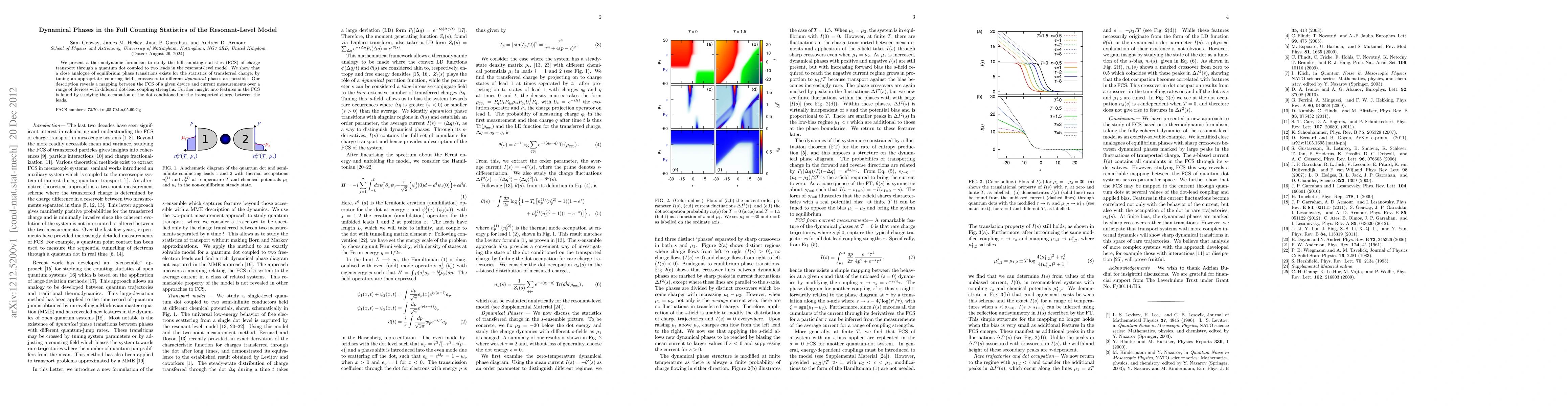 This paper develops a thermodynamic framework to analyze the full counting statistics of charge transport in a resonant-level quantum dot model, revealing phase transitions analogous to equilibrium and mapping these dynamics to varying device parameters. It also explores the relationship between the statistics of charge transfer and the dot's occupation state.