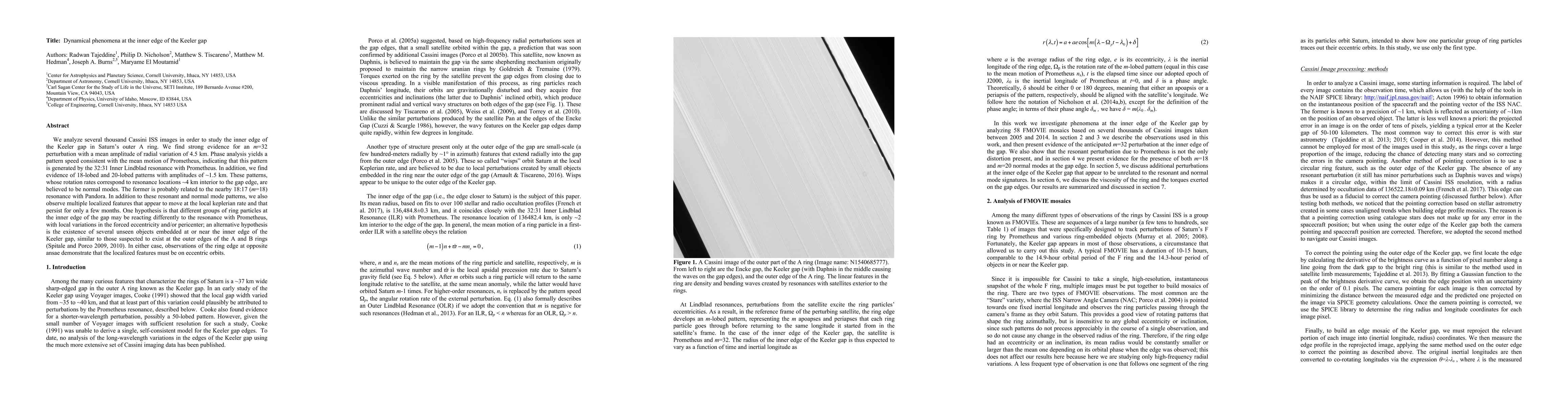 We analyze several thousand Cassini ISS images in order to study the inner edge of the Keeler gap in Saturn's outer A ring. We find strong evidence for an m=32 perturbation with a mean amplitude of radial variation of 4.5 km. Phase analysis yields a pattern speed consistent with the mean motion of Prometheus, indicating that this pattern is generated by the 32:31 Inner Lindblad resonance with Prometheus. In addition, we find evidence of 18-lobed and 20-lobed patterns with amplitudes of ~1.5 km. These patterns, whose rotation rates correspond to resonance locations ~4 km interior to the gap edge, are believed to be normal modes. The former is probably related to the nearby 18:17 (m=18) resonance with Pandora. In addition to these resonant and normal mode patterns, we also observe multiple localized features that appear to move at the local keplerian rate and that persist for only a few months. One hypothesis is that different groups of ring particles at the inner edge of the gap may be reacting differently to the resonance with Prometheus, with local variations in the forced eccentricity and/or pericenter; an alternative hypothesis is the existence of several unseen objects embedded at or near the inner edge of the Keeler gap, similar to those suspected to exist at the outer edges of the A and B rings (Spitale and Porco 2009, 2010). In either case, observations of the ring edge at opposite ansae demonstrate that the localized features must be on eccentric orbits.