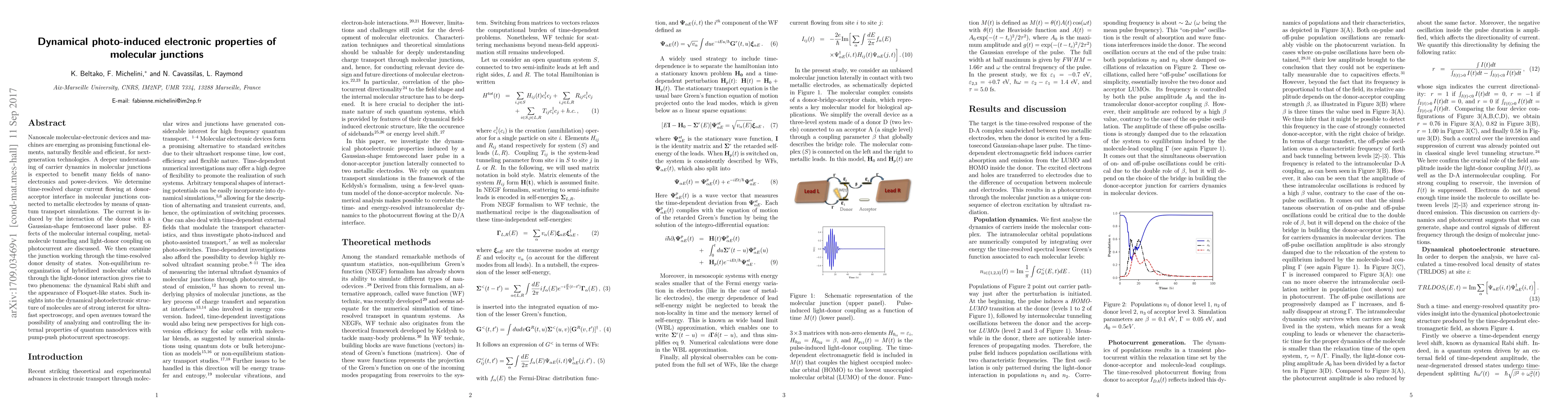 Nanoscale molecular-electronic devices and machines are emerging as promising functional elements, naturally flexible and efficient, for next generation technologies. A deeper understanding of carrier dynamics in molecular junctions is expected to benefit many fields of nanoelectronics and power-devices. We determine time-resolved charge current flowing at donor- acceptor interface in molecular junctions connected to metallic electrodes by means of quantum transport simulations. The current is induced by the interaction of the donor with a Gaussian-shape femtosecond laser pulse. Effects of the molecular internal coupling, metal- molecule tunneling and light-donor coupling on photocurrent are discussed. We then examine the junction working through the time-resolved donor density of states. Non-equilibrium reorganization of hybridized molecular orbitals through the light-donor interaction gives rise to two phenomena: the dynamical Rabi shift and the appearance of Floquet-like states. Such insights into the dynamical photoelectronic structure of molecules are of strong interest for ultrafast spectroscopy, and open avenues toward the possibility of analyzing and controlling the internal properties of quantum nanodevices with pump-push photocurrent spectroscopy.