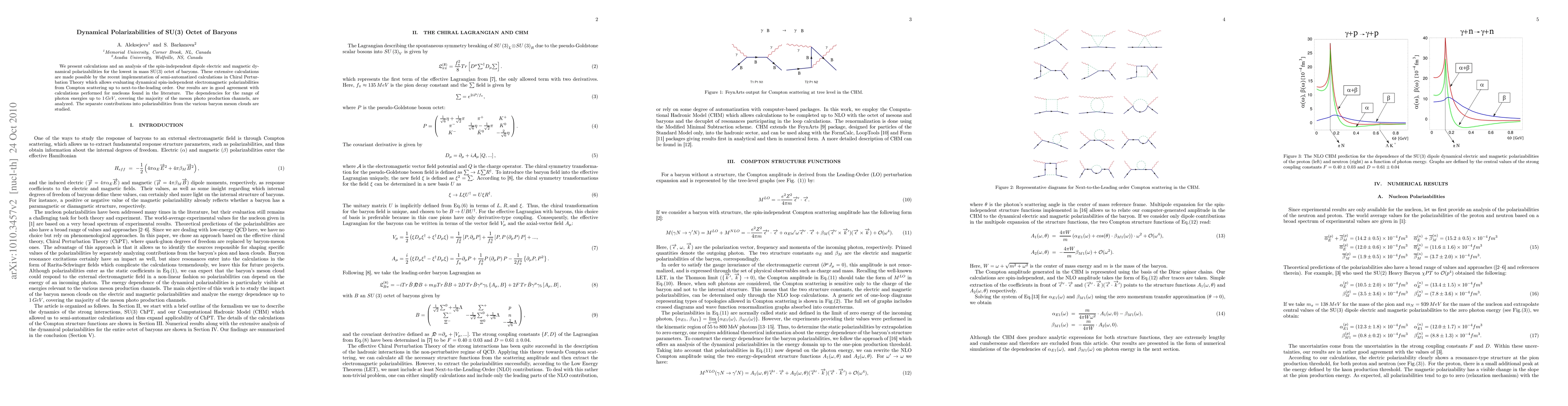 We present calculations and an analysis of the spin-independent dipole electric and magnetic dynamical polarizabilities for the lowest in mass SU(3) octet of baryons. These extensive calculations are made possible by the recent implementation of semi-automatized calculations in Chiral Perturbation Theory which allows evaluating dynamical spin-independent electromagnetic polarizabilities from Compton scattering up to next-to-the-leading order. Our results are in good agreement with calculations performed for nucleons found in the literature. The dependencies for the range of photon energies up to 1 GeV, covering the majority of the meson photo production channels, are analyzed. The separate contributions into polarizabilities from the various baryon meson clouds are studied.