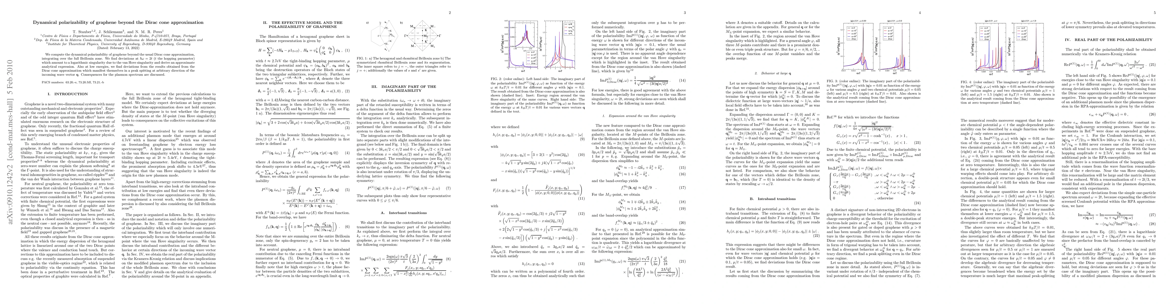 This paper calculates graphene's dynamical polarizability beyond the Dirac cone approximation, revealing logarithmic singularities due to the van Hove singularity at $\hbar\omega=2t$ and energy-dependent deviations leading to peak splitting in plasmon spectra.