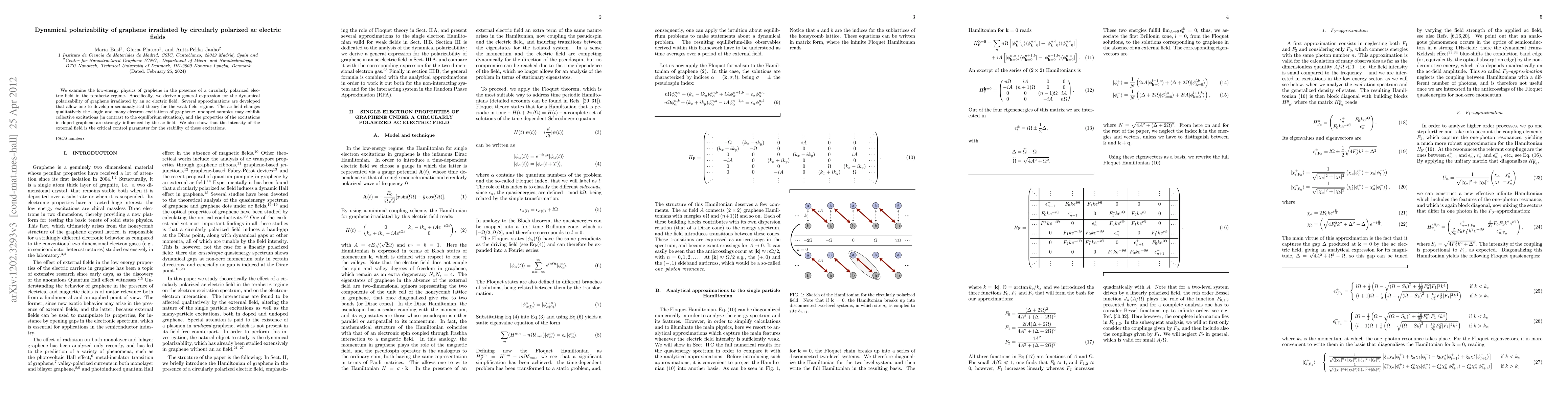 We examine the low-energy physics of graphene in the presence of a circularly polarized electric field in the terahertz regime. Specifically, we derive a general expression for the dynamical polarizability of graphene irradiated by an ac electric field. Several approximations are developed that allow one to develop a semianalytical theory for the weak field regime. The ac field changes qualitatively the single and many electron excitations of graphene: undoped samples may exhibit collective excitations (in contrast to the equilibrium situation), and the properties of the excitations in doped graphene are strongly influenced by the ac field. We also show that the intensity of the external field is the critical control parameter for the stability of these excitations.