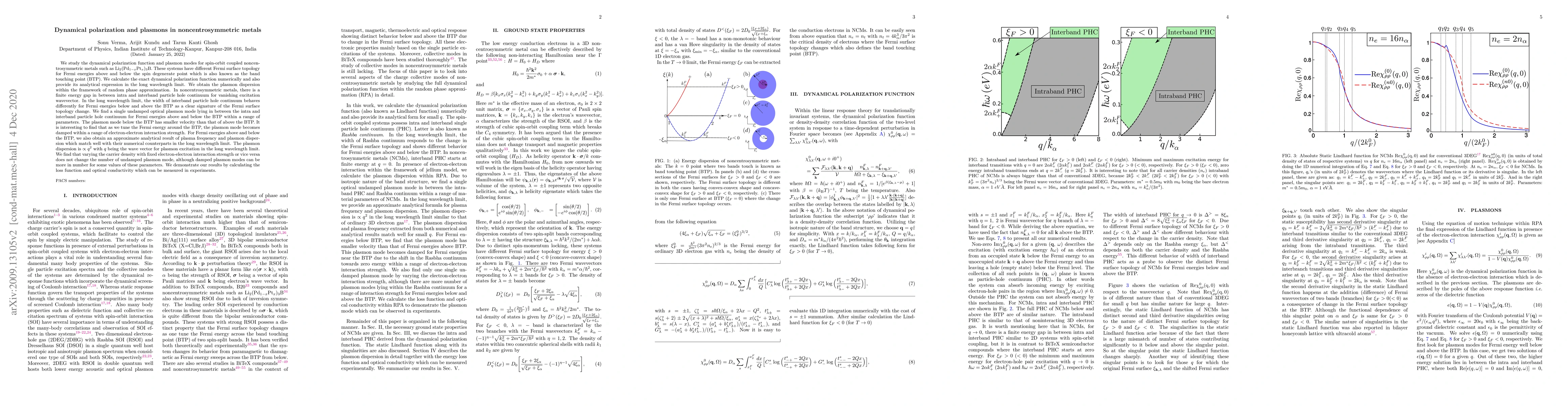 This paper investigates the dynamical polarization and plasmon modes in spin-orbit coupled noncentrosymmetric metals, revealing distinct Fermi surface topologies and plasmon behaviors above and below the band touching point. It finds a single undamped optical plasmon mode with varying velocities and damping characteristics depending on the Fermi energy, and provides analytical and numerical results for plasmon dispersion.