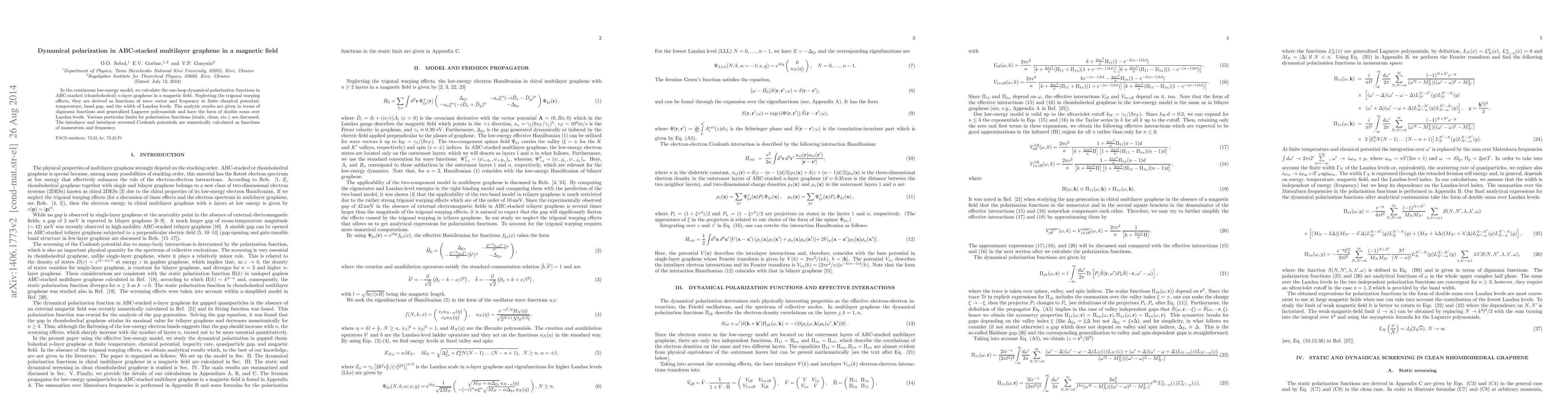 This paper calculates one-loop dynamical polarization functions in ABC-stacked multilayer graphene under a magnetic field, deriving analytic results in terms of digamma functions and generalized Laguerre polynomials. Numerical calculations also determine intralayer and interlayer screened Coulomb potentials as functions of momentum and frequency.