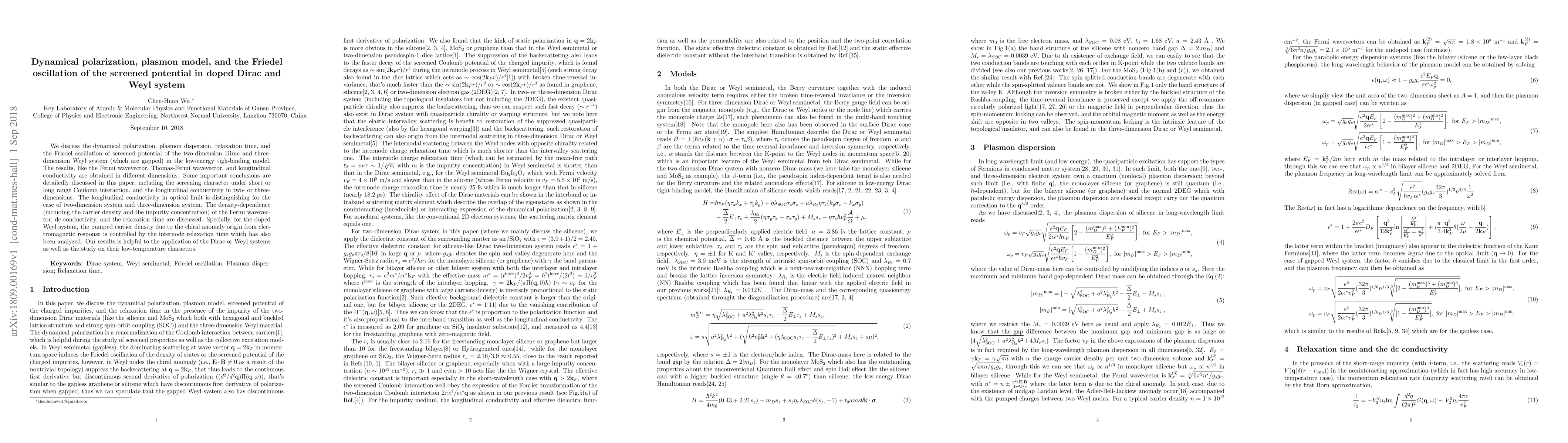 This paper investigates the dynamical polarization, plasmon dispersion, and Friedel oscillation in doped Dirac and Weyl systems using a low-energy tight-binding model. Key findings include the analysis of longitudinal conductivity differences in two- and three-dimensional systems, the impact of carrier density and impurity concentration on Fermi wavevector and dc conductivity, and the role of internode relaxation time in the chiral anomaly-induced pumped carrier density in doped Weyl systems.
