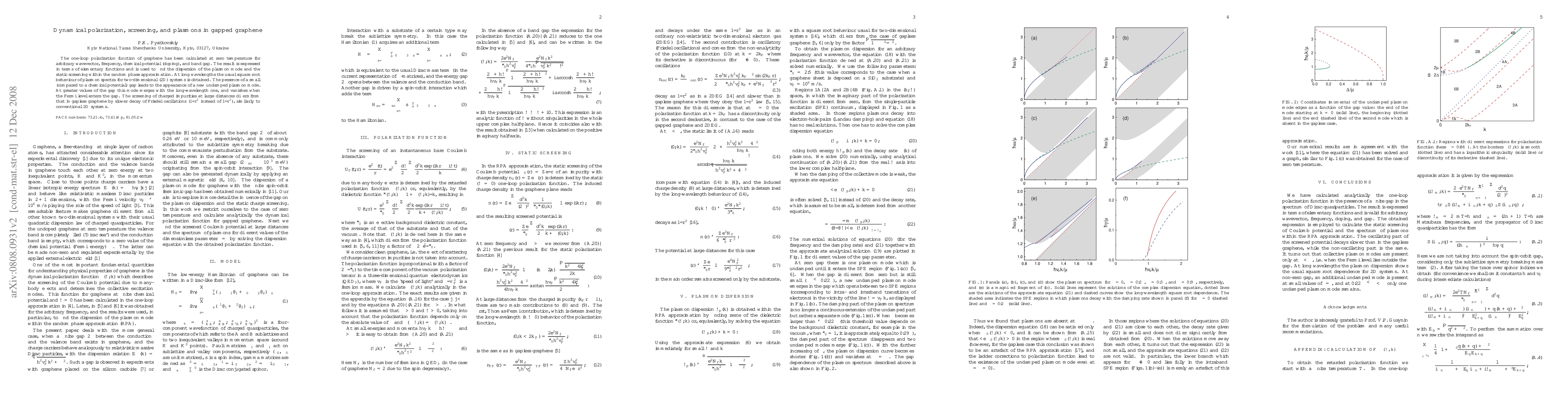This paper calculates the one-loop polarization function of gapped graphene, revealing a new undamped plasmon mode due to a small band gap. The study also shows that the static screening of charged impurities decays more slowly in gapped graphene compared to gapless graphene.