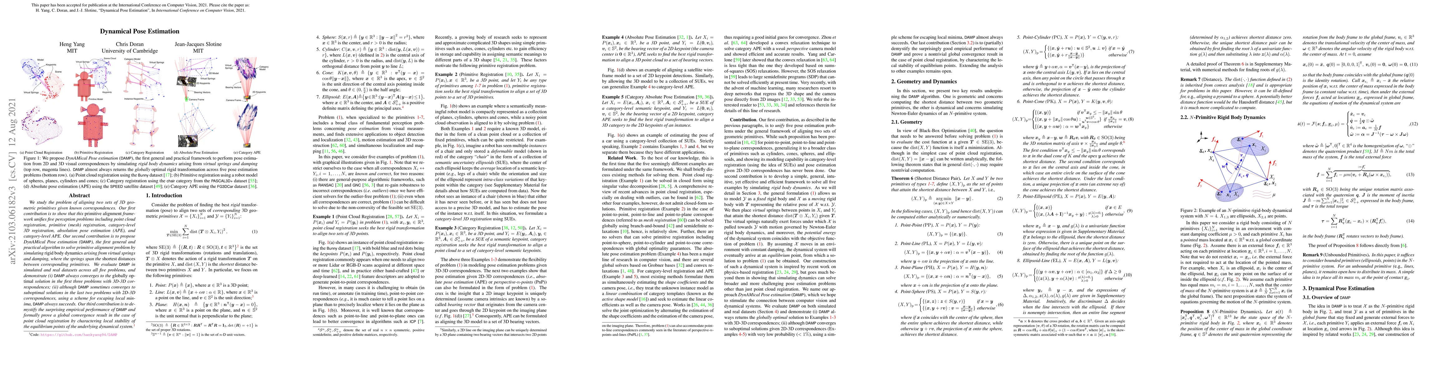 We study the problem of aligning two sets of 3D geometric primitives given known correspondences. Our first contribution is to show that this primitive alignment framework unifies five perception problems including point cloud registration, primitive (mesh) registration, category-level 3D registration, absolution pose estimation (APE), and category-level APE. Our second contribution is to propose DynAMical Pose estimation (DAMP), the first general and practical algorithm to solve primitive alignment problem by simulating rigid body dynamics arising from virtual springs and damping, where the springs span the shortest distances between corresponding primitives. We evaluate DAMP in simulated and real datasets across all five problems, and demonstrate (i) DAMP always converges to the globally optimal solution in the first three problems with 3D-3D correspondences; (ii) although DAMP sometimes converges to suboptimal solutions in the last two problems with 2D-3D correspondences, using a scheme for escaping local minima, DAMP always succeeds. Our third contribution is to demystify the surprising empirical performance of DAMP and formally prove a global convergence result in the case of point cloud registration by charactering local stability of the equilibrium points of the underlying dynamical system.