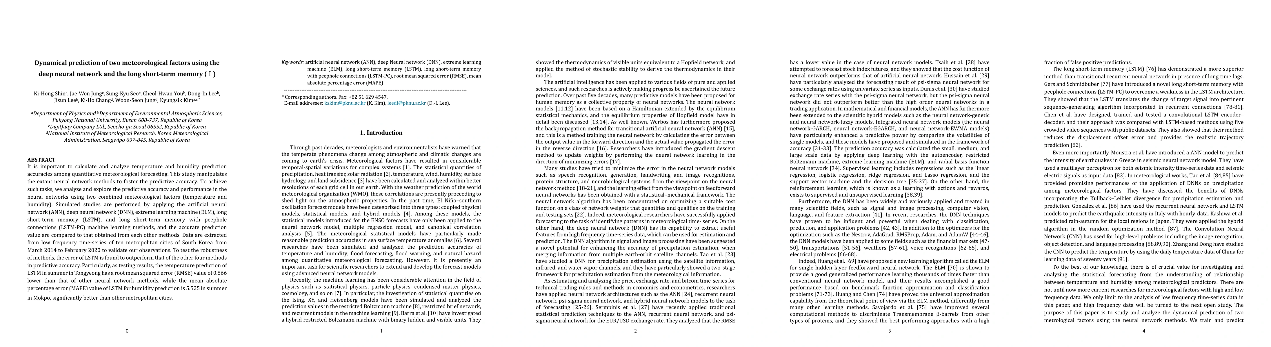 This study compares the predictive accuracy of various neural network methods, including LSTM, for forecasting temperature and humidity in South Korean metropolitan cities. LSTM demonstrates superior performance, with a lower RMSE for temperature in Tongyeong and a lower MAPE for humidity in Mokpo compared to other methods.