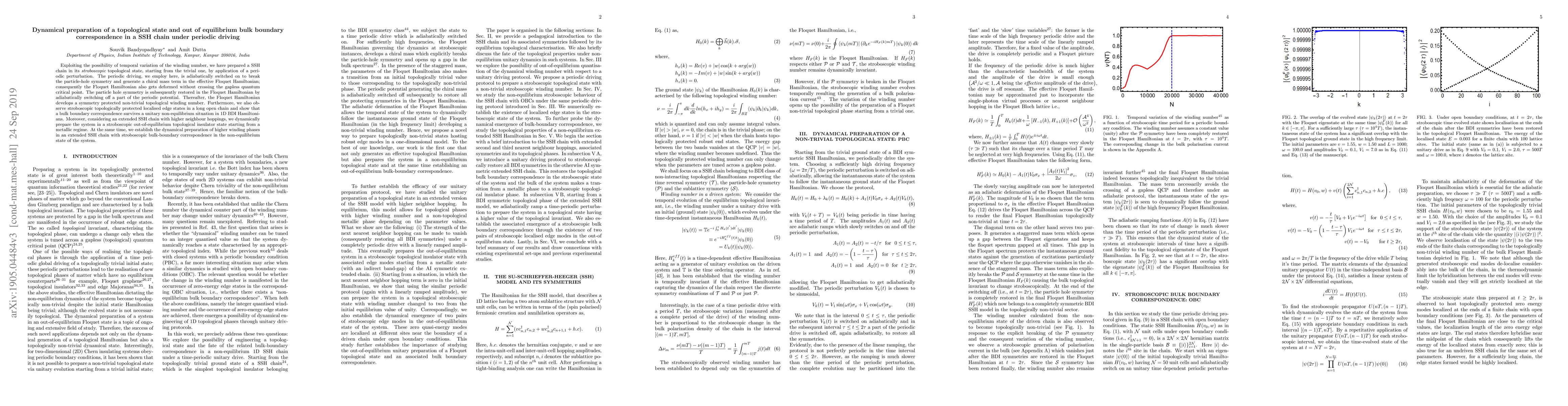 Exploiting the possibility of temporal variation of the winding number, we have prepared a SSH chain in its {\it stroboscopic} topological state, starting from the trivial one, by application of a periodic perturbation. The periodic driving, we employ here, is adiabatically switched on to break the particle-hole symmetry and generate a chiral mass term in the effective Floquet Hamiltonian; consequently the Floquet Hamiltonian also gets deformed without crossing the gapless quantum critical point. The particle hole symmetry is subsequently restored in the Floquet Hamiltonian by adiabatically switching off a part of the periodic potential. Thereafter, the Floquet Hamiltonian develops a symmetry protected non-trivial topological winding number. Furthermore, we also observe stroboscopic topologically protected localised edge states in a long open chain and show that a bulk boundary correspondence survives a unitary non-equilibrium situation in 1D BDI Hamiltonians. Moreover, considering an extended SSH chain with higher neighbour hoppings, we dynamically prepare the system in a stroboscopic out-of-equilibrium topological insulator state starting from a metallic regime. At the same time, we establish the dynamical preparation of higher winding phases in an extended SSH chain with stroboscopic bulk-boundary correspondence in the non-equilibrium state of the system.