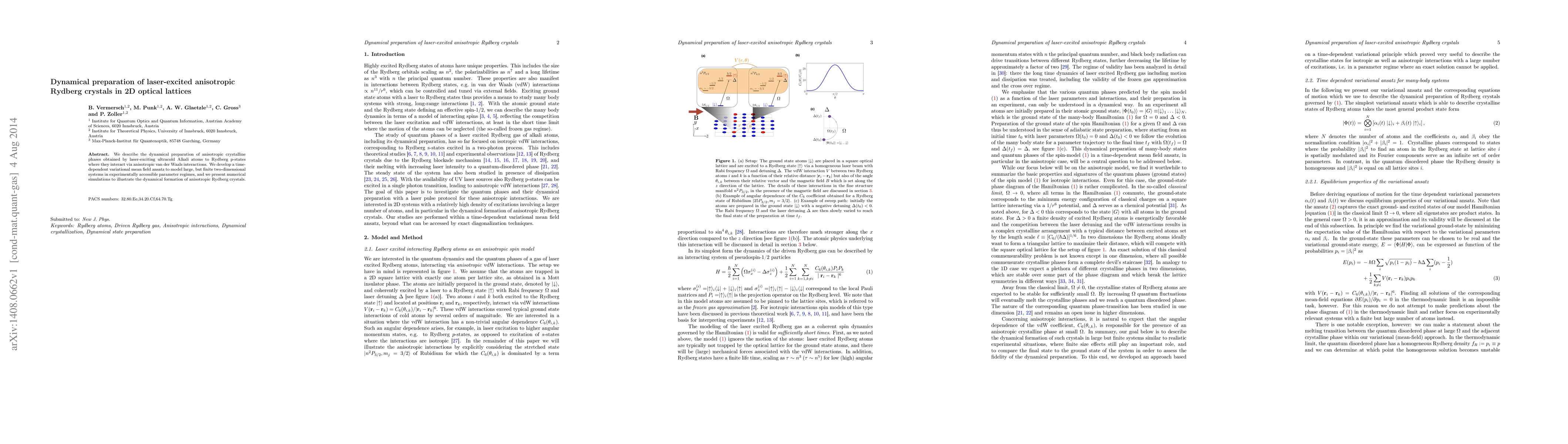 We describe the dynamical preparation of anisotropic crystalline phases obtained by laser-exciting ultracold Alkali atoms to Rydberg p-states where they interact via anisotropic van der Waals interactions. We develop a time- dependent variational mean field ansatz to model large, but finite two-dimensional systems in experimentally accessible parameter regimes, and we present numerical simulations to illustrate the dynamical formation of anisotropic Rydberg crystals.