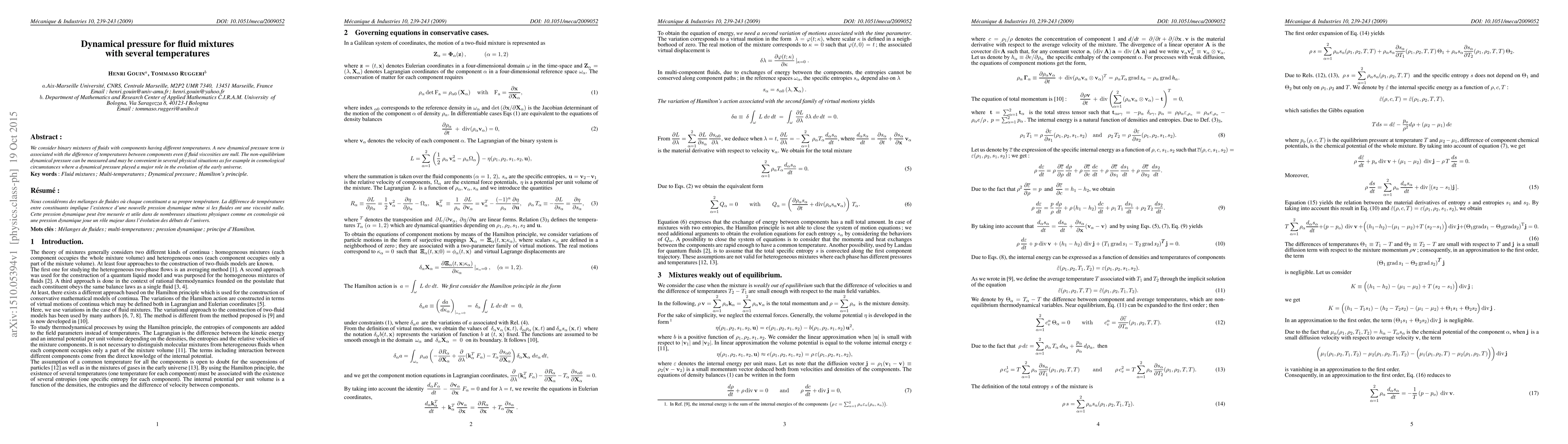 We consider binary mixtures of fluids with components having different temperatures. A new dynamical pressure term is associated with the difference of temperatures between components even if fluid viscosities are null. The non-equilibrium dynamical pressure can be measured and may be convenient in several physical situations as for example in cosmological circumstances where a dynamical pressure played a major role in the evolution of the early universe.