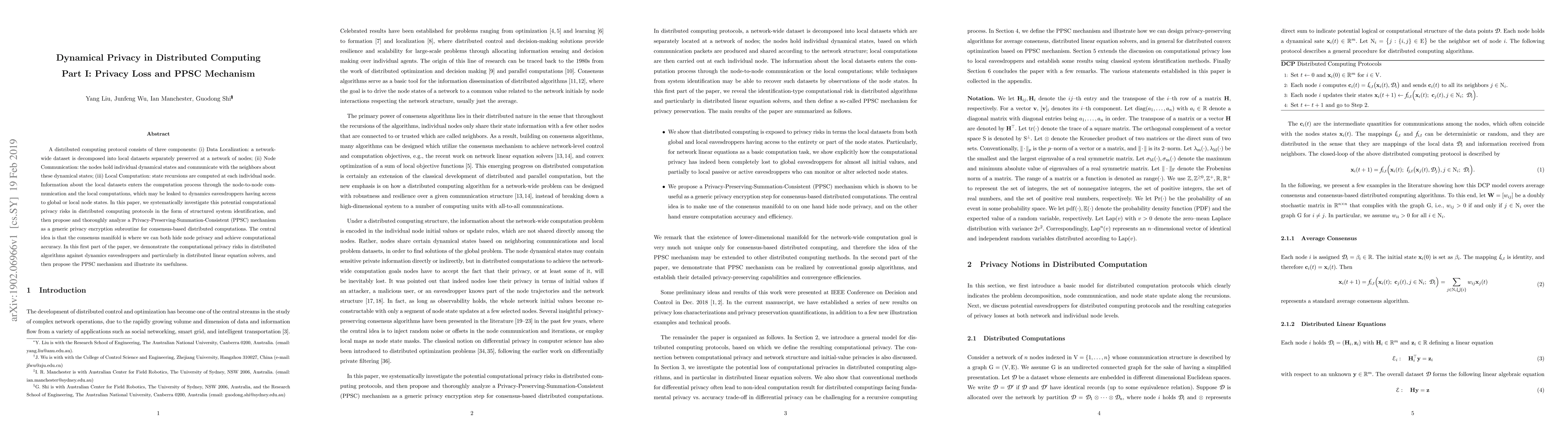 A distributed computing protocol consists of three components: (i) Data Localization: a network-wide dataset is decomposed into local datasets separately preserved at a network of nodes; (ii) Node Communication: the nodes hold individual dynamical states and communicate with the neighbors about these dynamical states; (iii) Local Computation: state recursions are computed at each individual node. Information about the local datasets enters the computation process through the node-to-node communication and the local computations, which may be leaked to dynamics eavesdroppers having access to global or local node states. In this paper, we systematically investigate this potential computational privacy risks in distributed computing protocols in the form of structured system identification, and then propose and thoroughly analyze a Privacy-Preserving-Summation-Consistent (PPSC) mechanism as a generic privacy encryption subroutine for consensus-based distributed computations. The central idea is that the consensus manifold is where we can both hide node privacy and achieve computational accuracy. In this first part of the paper, we demonstrate the computational privacy risks in distributed algorithms against dynamics eavesdroppers and particularly in distributed linear equation solvers, and then propose the PPSC mechanism and illustrate its usefulness.