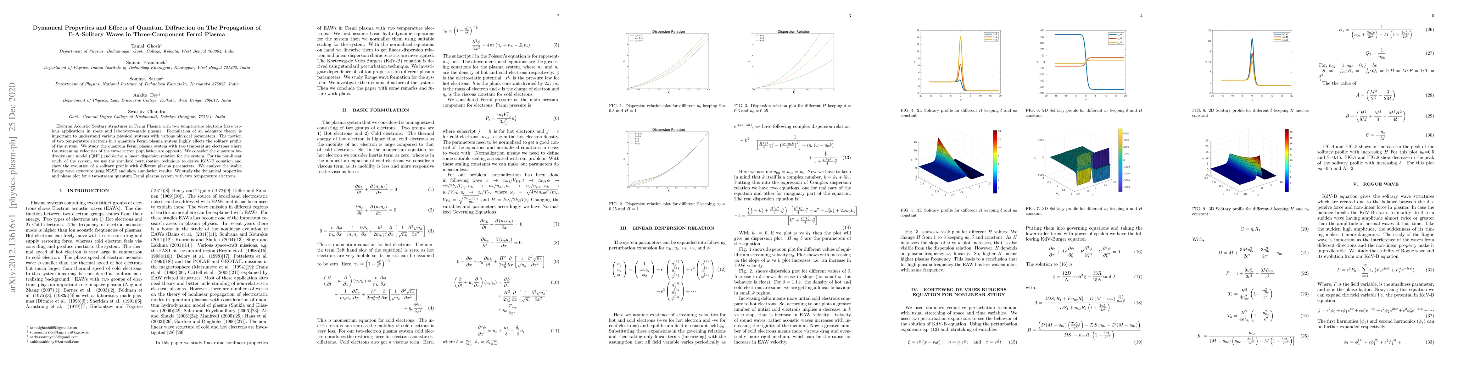 Electron Acoustic Solitary structures in Fermi Plasma with two temperature electrons have various applications in space and laboratory-made plasma. Formulation of an adequate theory is important to understand various physical systems with various physical parameters. The motion of two temperature electrons in a quantum Fermi plasma system highly affects the solitary profile of the system. We study the quantum Fermi plasma system with two temperature electrons where the streaming velocities of the two-electron population are opposite. We consider the quantum hydrodynamic model (QHD) and derive a linear dispersion relation for the system. For the non-linear study of the system, we use the standard perturbation technique to derive KdV-B equation and show the evolution of a solitary profile with different plasma parameters. We analyze the stable Rouge wave structure using NLSE and show simulation results. We study the dynamical properties and phase plot for a two-stream quantum Fermi plasma system with two temperature electrons.
