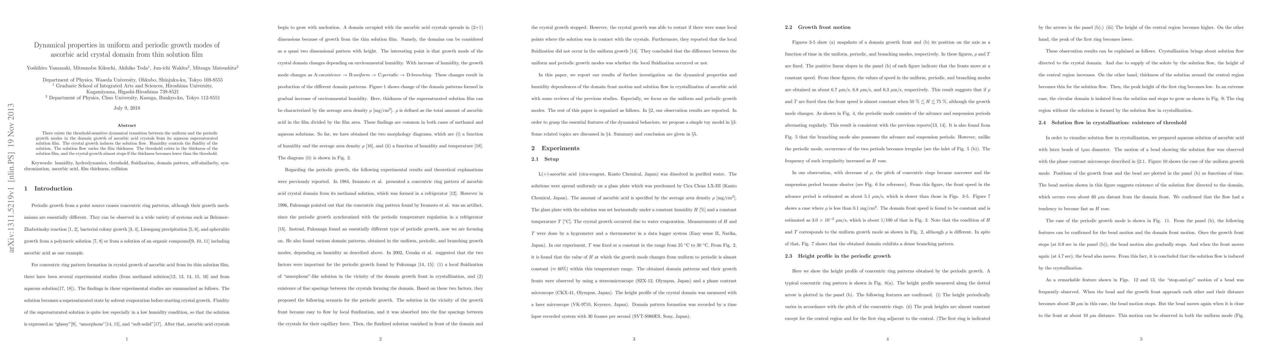 There exists the threshold-sensitive dynamical transition between the uniform and the periodic growth modes in the domain growth of ascorbic acid crystals from its aqueous supersaturated solution film. The crystal growth induces the solution flow. Humidity controls the fluidity of the solution. The solution flow varies the film thickness. The threshold exists in the thickness of the solution film, and the crystal growth almost stops if the thickness becomes lower than the threshold.