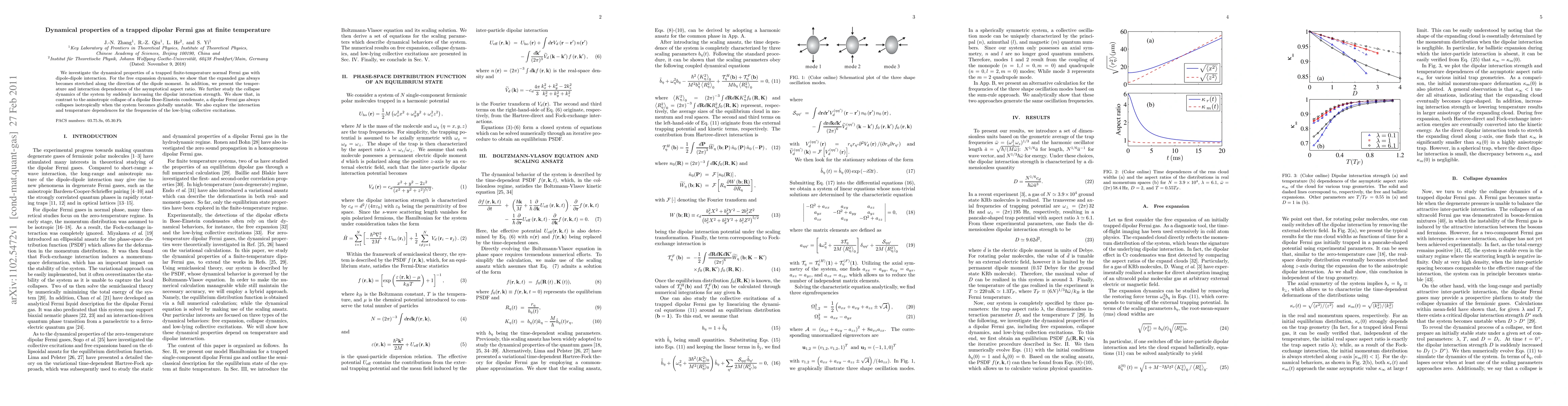 This paper explores the dynamical properties of a trapped dipolar Fermi gas at finite temperature, showing that the gas expands anisotropically along the dipole moment direction and collapses isotropically when unstable. The study also examines the temperature and interaction dependence of the aspect ratio and frequencies of collective excitations.