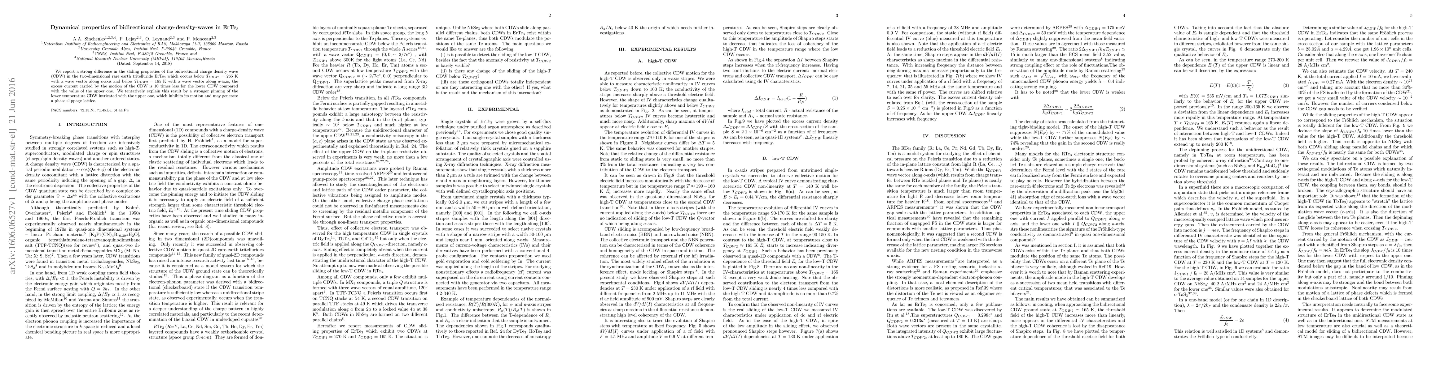 Researchers found two types of bidirectional charge density waves in ErTe$_3$ with different sliding properties below 265 K and 165 K, which may be due to stronger pinning that inhibits motion and generates phase slippage.