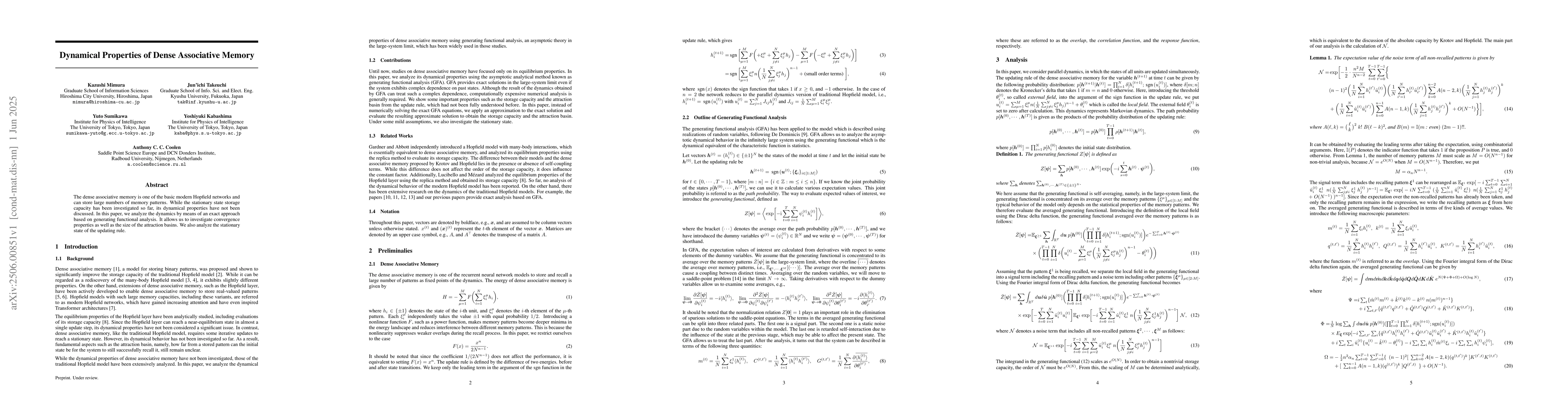 The dense associative memory is one of the basic modern Hopfield networks and can store large numbers of memory patterns. While the stationary state storage capacity has been investigated so far, its dynamical properties have not been discussed. In this paper, we analyze the dynamics by means of an exact approach based on generating functional analysis. It allows us to investigate convergence properties as well as the size of the attraction basins. We also analyze the stationary state of the updating rule.