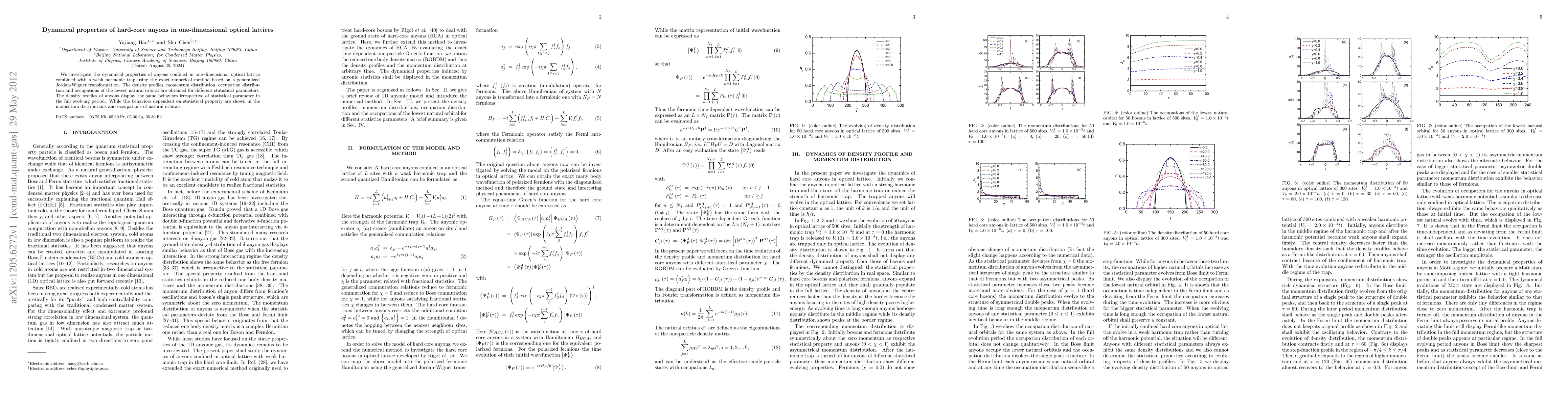 This paper examines the dynamical properties of hard-core anyons in one-dimensional optical lattices with a weak harmonic trap, using exact numerical methods. It finds consistent density profiles across different statistical parameters, but reveals statistical-dependent behaviors in momentum distributions and occupations of natural orbitals.