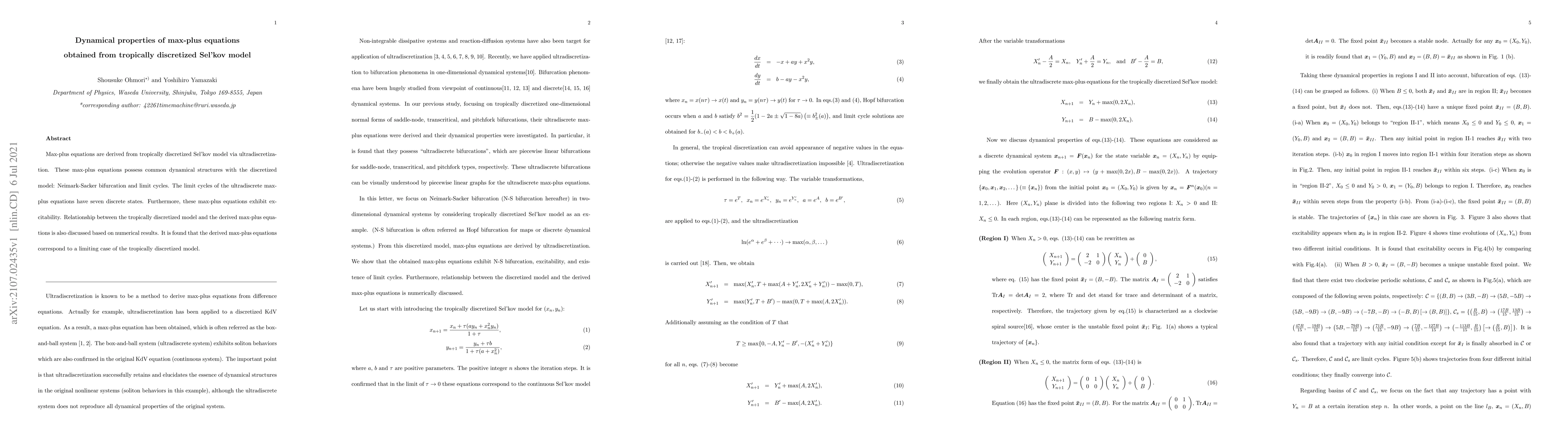 This paper investigates the dynamical properties of max-plus equations derived from a tropically discretized Sel'kov model, revealing the presence of Neimark-Sacker bifurcation, limit cycles with seven discrete states, and excitability. The study finds a correspondence between the derived max-plus equations and a limiting case of the tropically discretized model.