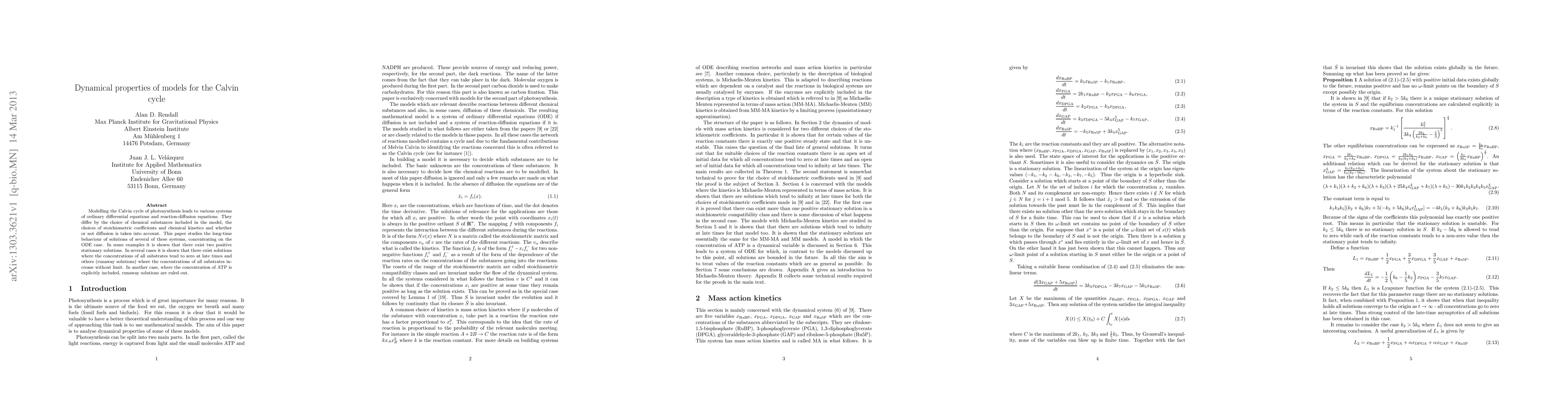 Modelling the Calvin cycle of photosynthesis leads to various systems of ordinary differential equations and reaction-diffusion equations. They differ by the choice of chemical substances included in the model, the choices of stoichiometric coefficients and chemical kinetics and whether or not diffusion is taken into account. This paper studies the long-time behaviour of solutions of several of these systems, concentrating on the ODE case. In some examples it is shown that there exist two positive stationary solutions. In several cases it is shown that there exist solutions where the concentrations of all substrates tend to zero at late times and others (runaway solutions) where the concentrations of all substrates increase without limit. In another case, where the concentration of ATP is explicitly included, runaway solutions are ruled out.