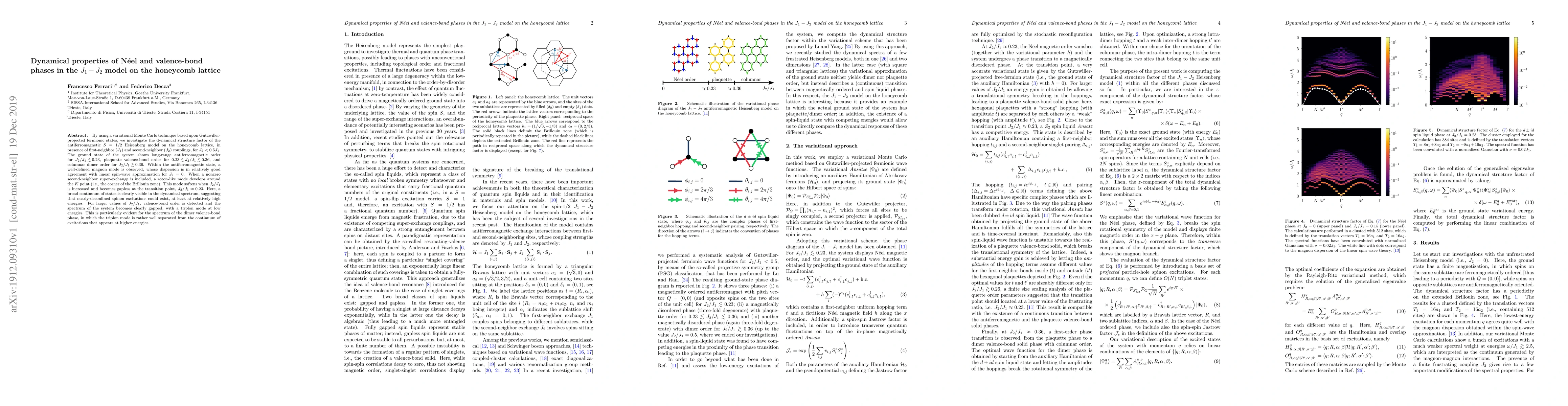 This paper uses variational Monte Carlo to study the dynamical structure factor of the $J_1-J_2$ model on a honeycomb lattice, revealing a transition from antiferromagnetic to valence-bond orders as $J_2/J_1$ increases. The study identifies a roton-like mode in the antiferromagnetic phase and a gapped spectrum with a triplon mode in the valence-bond phase.